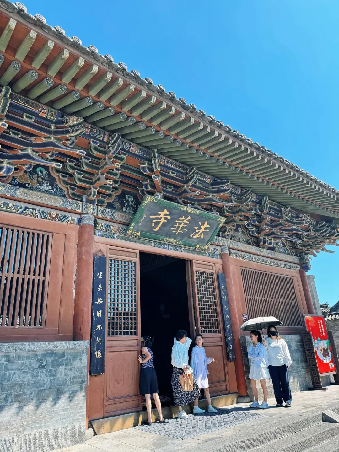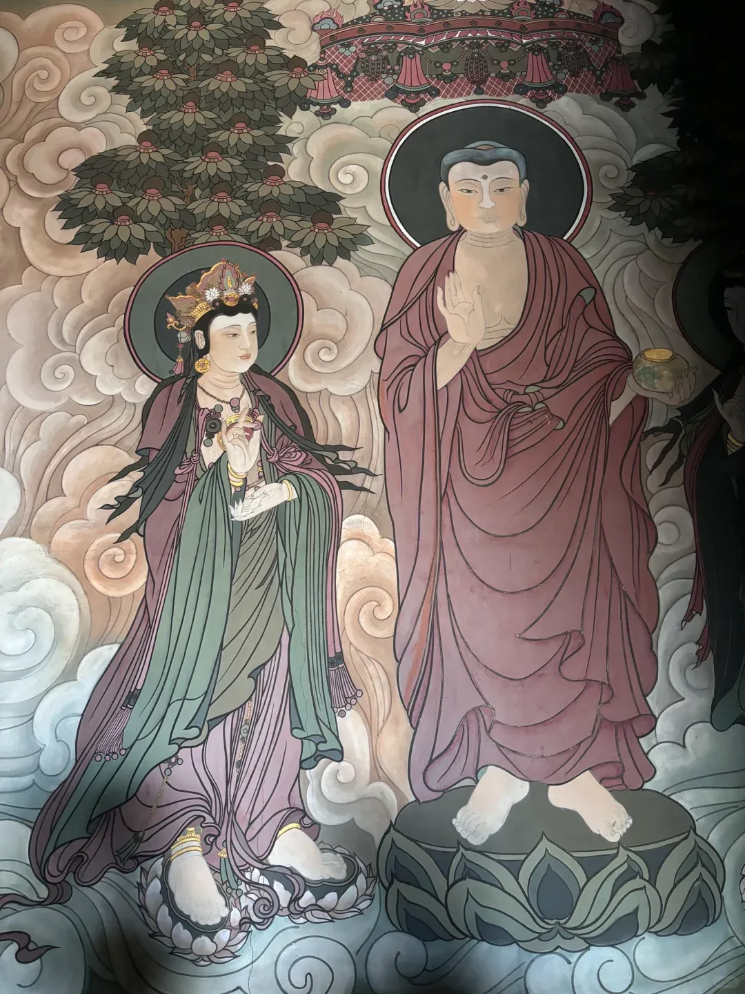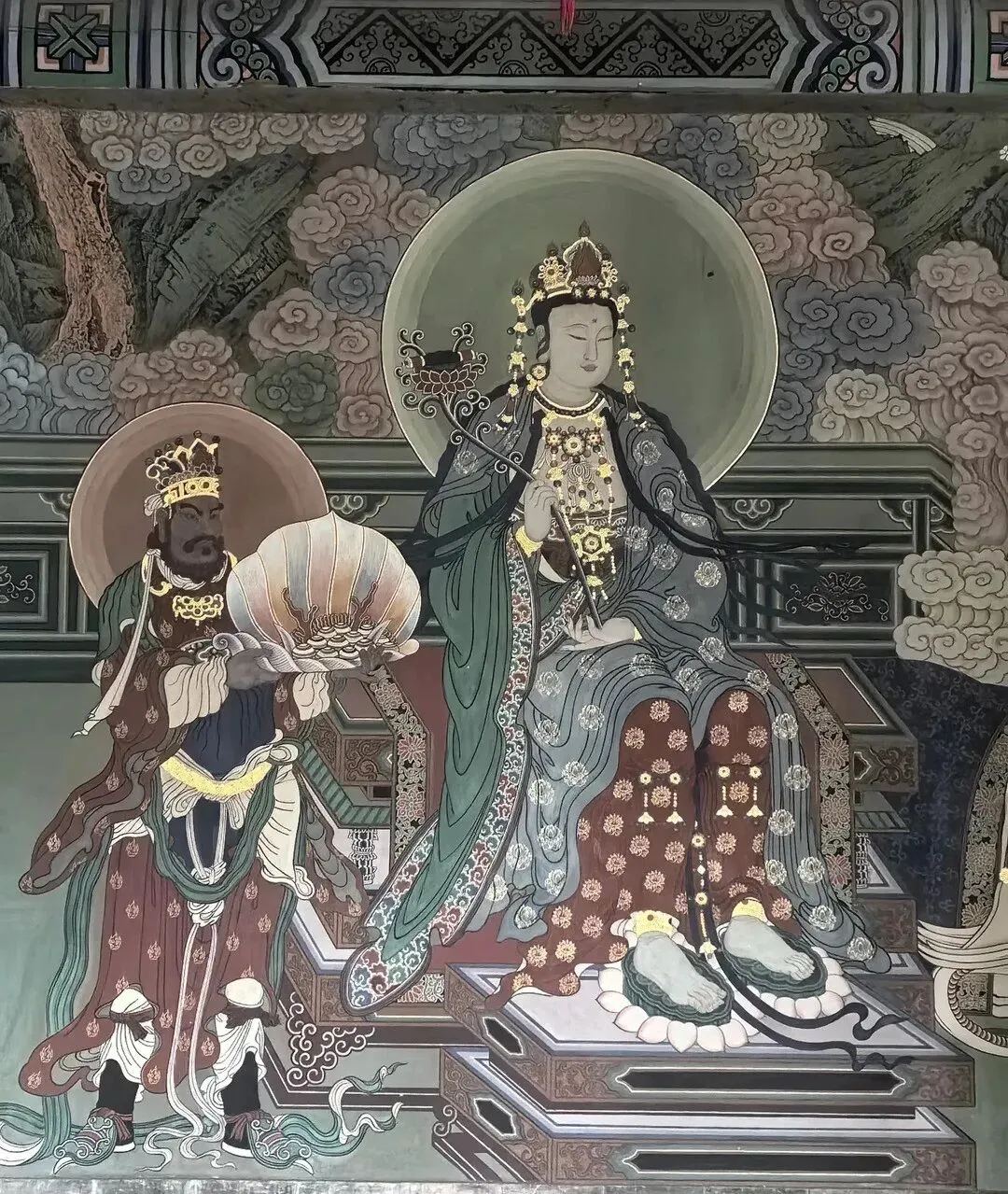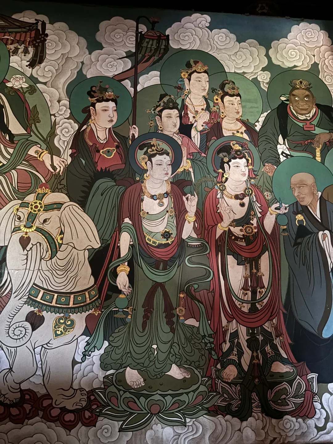 华严寺壁画是2009年由中央美术学院150多名师生在王颖生和孙景波教授的带领下,耗时三年完成的。共绘制了数千平米的重彩壁画。时任大同市长的耿彦波看到完工的壁画后感叹:“不让古人”。华严寺普光明殿壁画以文殊、普贤和水月观音菩萨画像为中心分为三大部分。在空间上分别位于两侧山墙、稍间壁与佛像的扇面墙! 南侧山墙壁画的主像为文殊菩萨画像。文殊菩萨乘狮,手执如意,半跏跌坐,安详平静,垂怜众生;一旁的善财童子毕恭毕敬。 普贤菩萨画像为中心的北侧山墙展现了第四十参到第五十三参的故事画面。普贤菩萨与文殊菩萨遥遥相对,普贤菩萨半跏趺坐于六牙白象的背上,手持梵经,微微含笑,慈眉下视;一旁的善财童主子正拱手参拜。 在大殿之中近千平方米的壁画里,最精彩的一幅当属扇面墙背后部分。整幅壁画长21米,高12米,以第二十八参水月观音菩萨为中心展开的第二十二参至第三十四参故事,共13个画面,壁画中水月观音的造型参照了北京法海寺壁画中的水月观音画像。大同法华寺,寺庙始建于明代,但在民国初期就已毁败。现在看到的法华寺,是依据历史资料在原址上复建的,于2010年左右完工。大同善化寺始建于唐开元年间,初名“开元寺”,五代时改称“大普恩寺”,在辽金战火中损毁大半,幸有寺中高僧圆满大师,带领弟子历经15 年筹措重建,直至1143 年落成,到1445年又被明英宗改名“善化寺”。 今天的善化寺,被誉为中国“保存蕞完整、整体性蕞佳”的辽金古建筑群,从南到北呈中轴线依次分布山门(金)、三圣殿(金)、大雄宝殿(辽),大雄宝殿一侧的朵殿普贤阁也是金代遗存。没有佛像的大同浑源的永安禅寺,建于金代,后在元代大规模重建。它的气质,是宋的典雅、金的雄浑与元的豪放,融合成的一座建筑孤例。