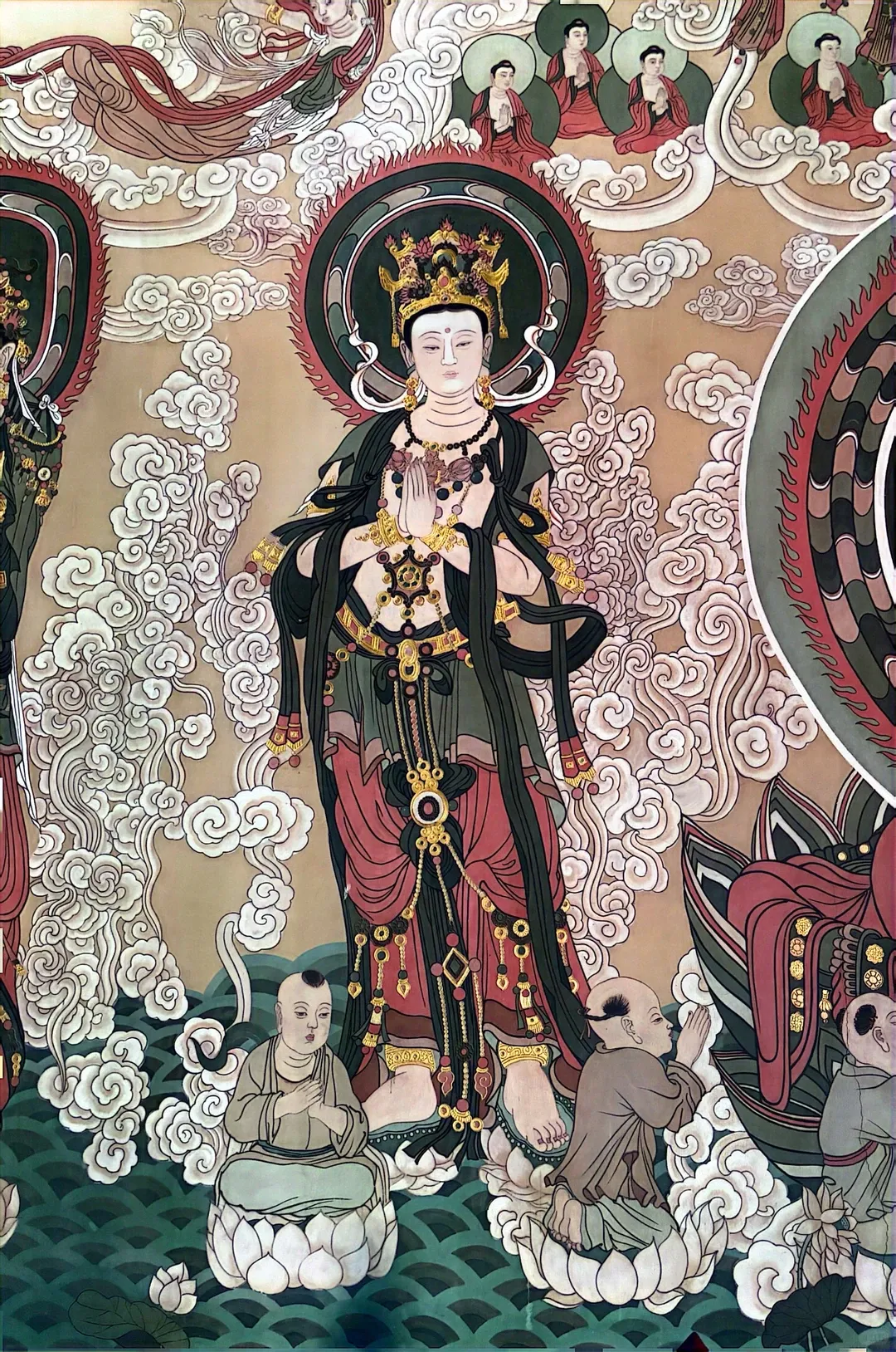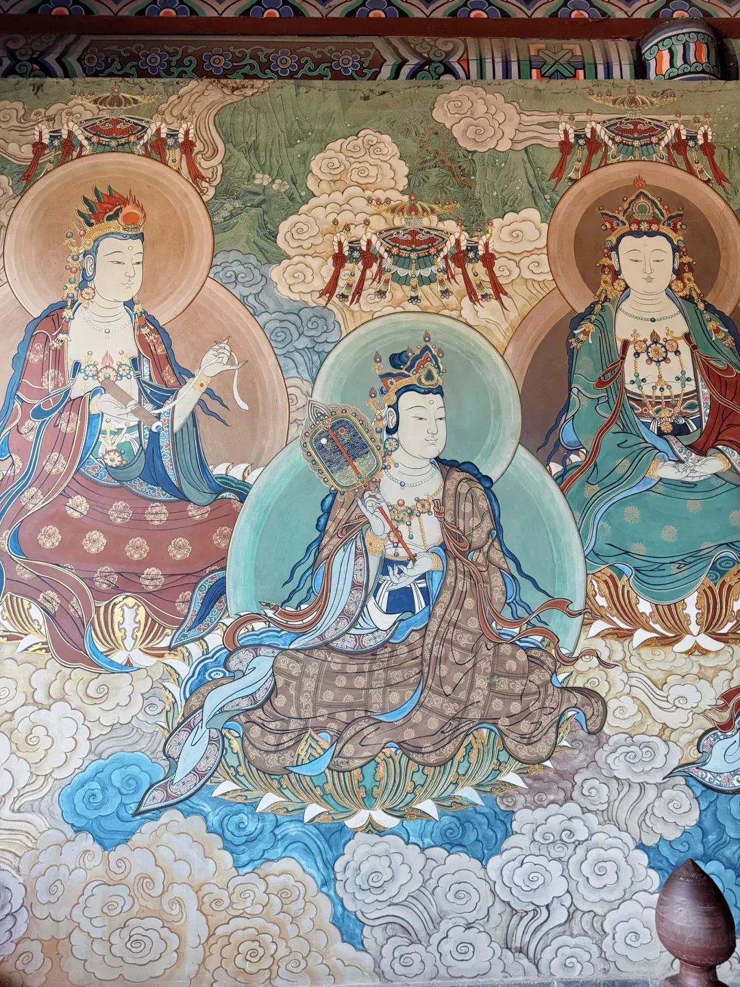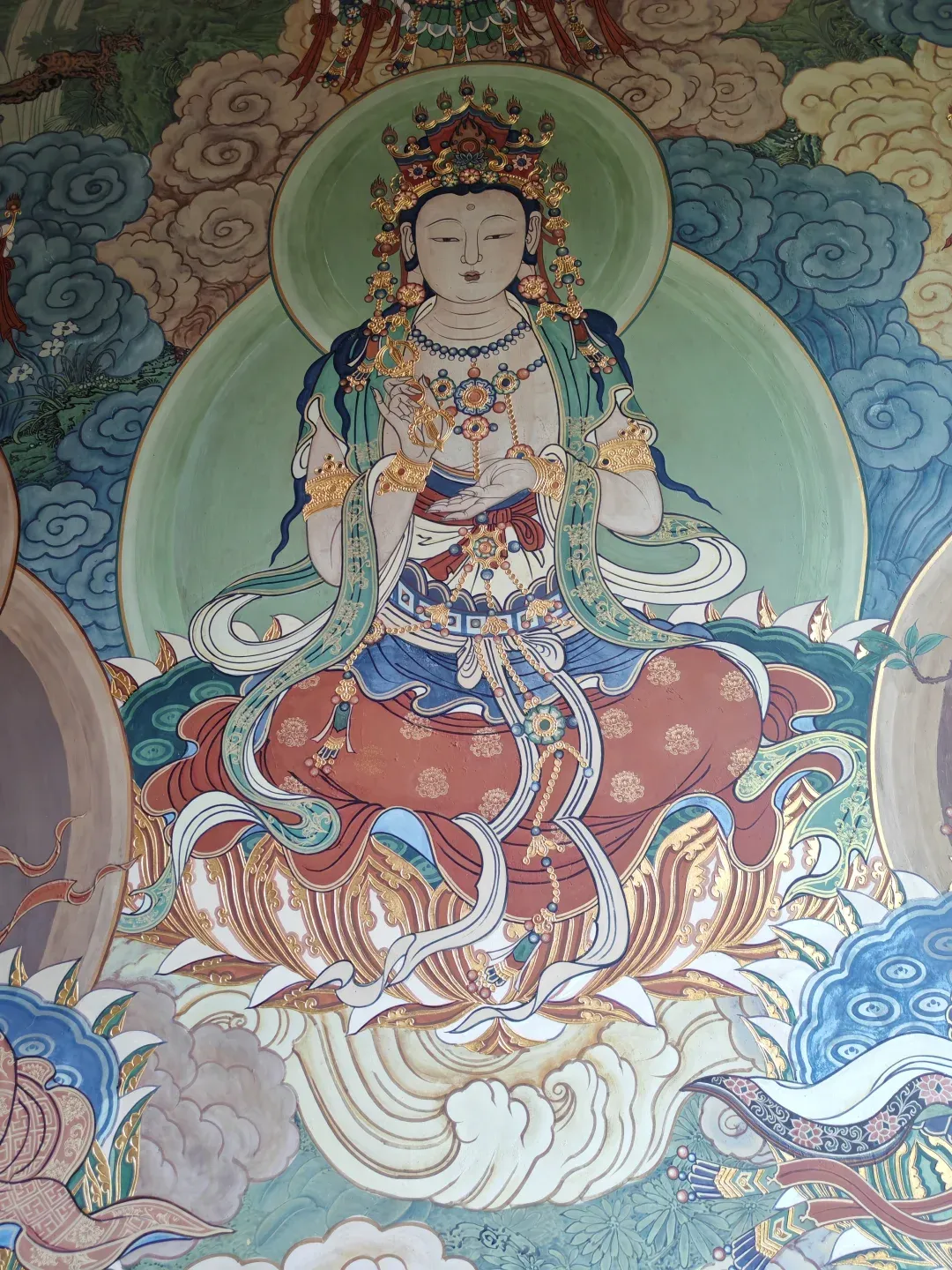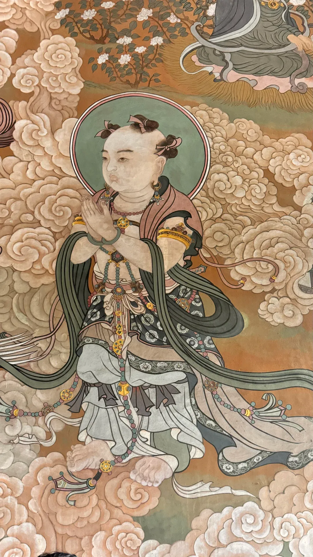 华严寺壁画是2009年由中央美术学院150多名师生在王颖生和孙景波教授的带领下,耗时三年完成的。共绘制了数千平米的重彩壁画。时任大同市长的耿彦波看到完工的壁画后感叹:“不让古人”。华严寺普光明殿壁画以文殊、普贤和水月观音菩萨画像为中心分为三大部分。在空间上分别位于两侧山墙、稍间壁与佛像的扇面墙! 南侧山墙壁画的主像为文殊菩萨画像。文殊菩萨乘狮,手执如意,半跏跌坐,安详平静,垂怜众生;一旁的善财童子毕恭毕敬。 普贤菩萨画像为中心的北侧山墙展现了第四十参到第五十三参的故事画面。普贤菩萨与文殊菩萨遥遥相对,普贤菩萨半跏趺坐于六牙白象的背上,手持梵经,微微含笑,慈眉下视;一旁的善财童主子正拱手参拜。 在大殿之中近千平方米的壁画里,最精彩的一幅当属扇面墙背后部分。整幅壁画长21米,高12米,以第二十八参水月观音菩萨为中心展开的第二十二参至第三十四参故事,共13个画面,壁画中水月观音的造型参照了北京法海寺壁画中的水月观音画像。大同法华寺,寺庙始建于明代,但在民国初期就已毁败。现在看到的法华寺,是依据历史资料在原址上复建的,于2010年左右完工。大同善化寺始建于唐开元年间,初名“开元寺”,五代时改称“大普恩寺”,在辽金战火中损毁大半,幸有寺中高僧圆满大师,带领弟子历经15 年筹措重建,直至1143 年落成,到1445年又被明英宗改名“善化寺”。 今天的善化寺,被誉为中国“保存蕞完整、整体性蕞佳”的辽金古建筑群,从南到北呈中轴线依次分布山门(金)、三圣殿(金)、大雄宝殿(辽),大雄宝殿一侧的朵殿普贤阁也是金代遗存。没有佛像的大同浑源的永安禅寺,建于金代,后在元代大规模重建。它的气质,是宋的典雅、金的雄浑与元的豪放,融合成的一座建筑孤例。