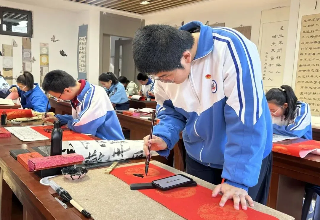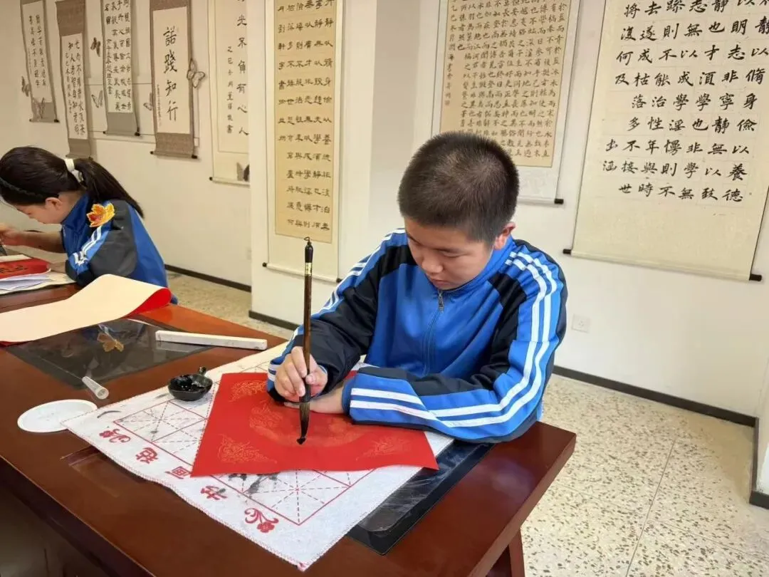 同学们热情高涨、兴致盎然,无论是懵懂奋进的六年级学子,还是意气风发的初中部同学,都端坐案前、凝神静气,手握毛笔,落笔从容。一笔一划间,或苍劲挺拔,或温婉秀丽,或灵动流畅,将对马年的美好期许、对校园的深情眷恋、对未来的无限憧憬,悉数倾注于笔端、流淌在纸间。