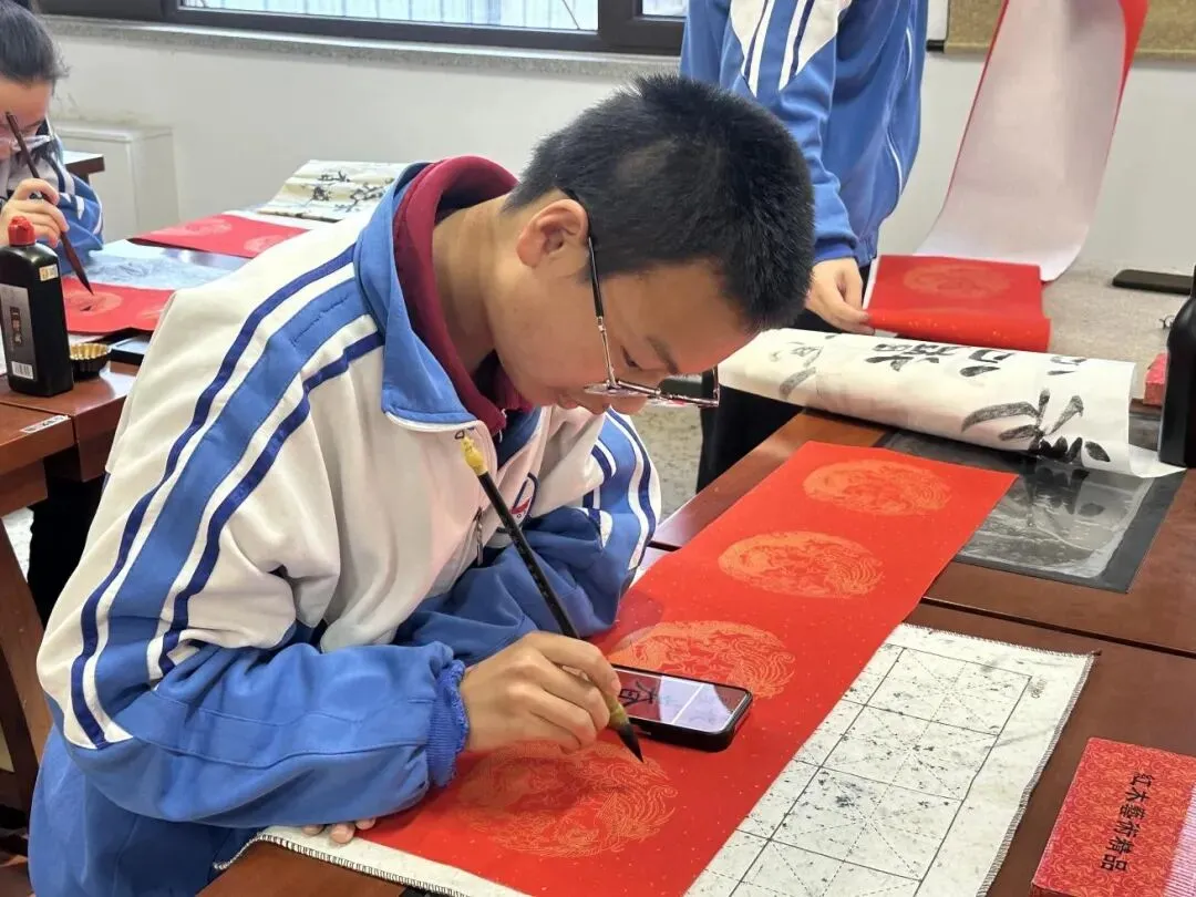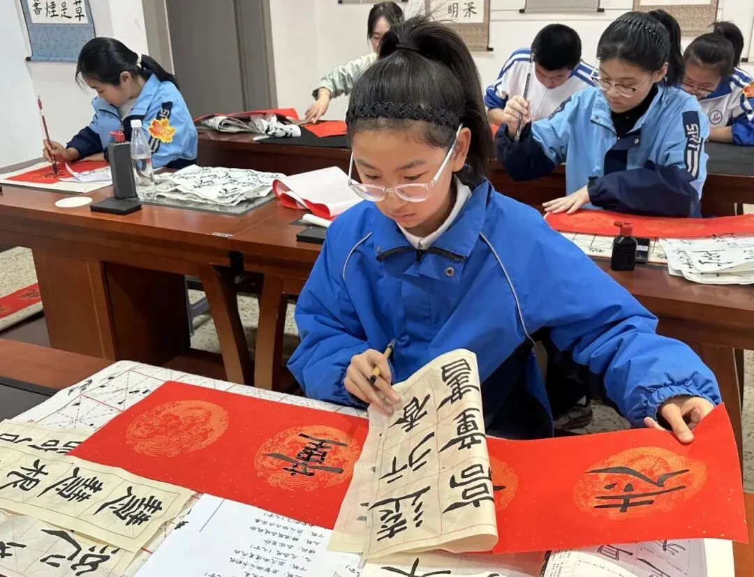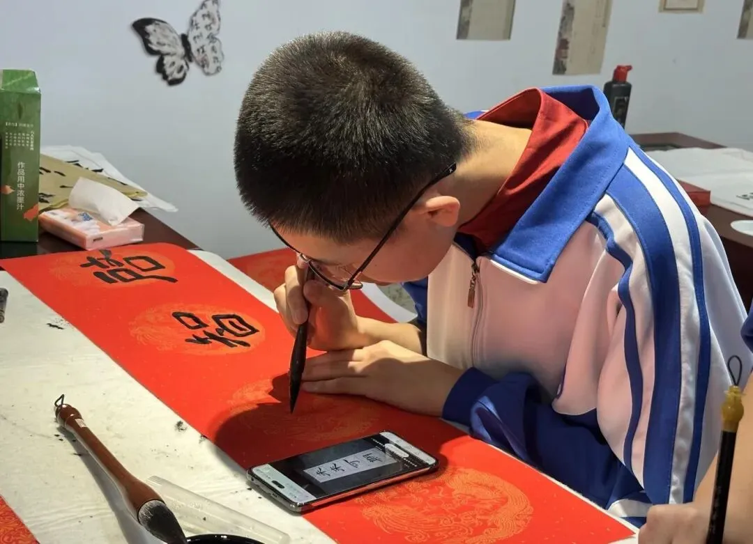 “立德修身行正道,笃学求真展宏图”……一幅幅对仗工整、寓意隽永的春联接连诞生,既有马年纳福的吉祥之意,也有立德树人的校园情怀,更有少年奋进的昂扬之气。用灵动的笔墨展现新时代青少年的文化素养与精神风貌,引得现场师生频频驻足赞叹、互相品鉴。