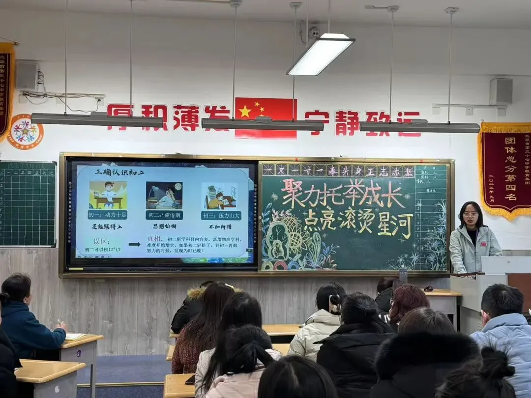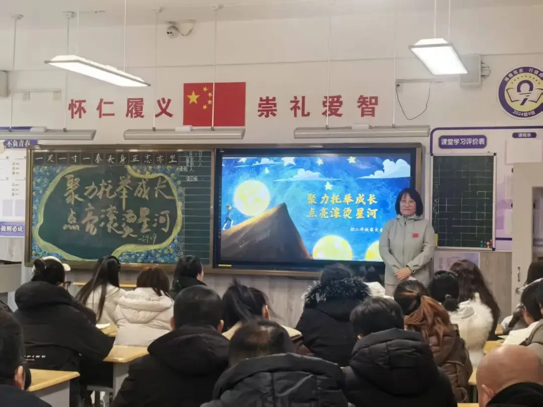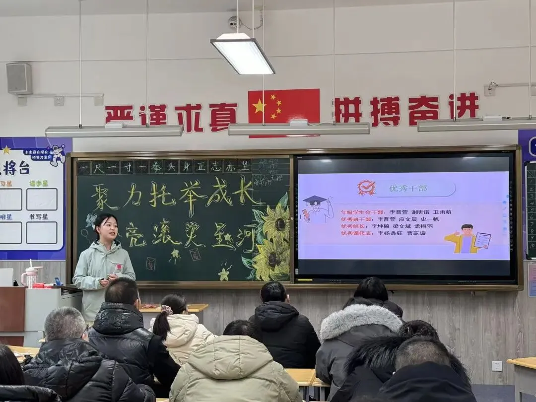 家长会伊始,初中部教研主任乔莉老师为家长致辞,话语温润而有力量。她先是系统梳理了初二上学期的育人成果——从课堂教学的深耕细作到特色活动的精彩纷呈,从学科能力的稳步提升到综合素养的全面进阶,每一项收获都凝聚着师生的共同努力。结合期末学情分析与寒假成长规划,乔莉主任向家长们提出三点殷切期许:其一,更新教育理念,多关注孩子的习惯养成与品格淬炼;其二,深耕高质量陪伴,在沉浸式相处中读懂孩子的心声,筑牢亲子情感根基;其三,锚定家校同频,与学校保持理念一致、行动同步,携手为初二这一成长关键期保驾护航。一番真挚务实的分享,既有专业的教育指引,又有暖心的育人建议,深深触动了在场家长,台下掌声雷动,久久不息。