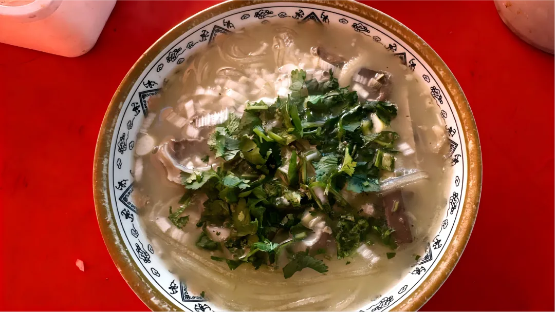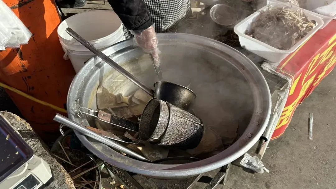 羊肉汤和羊杂割无疑是早市的“早餐顶流”。一口直径近一米的大锅内,乳白色的羊汤翻滚沸腾,羊肉的香气随着热气弥漫整个早餐区。