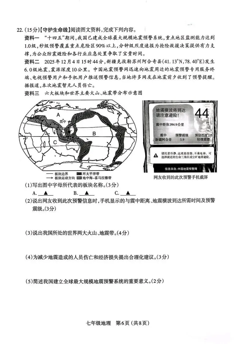 (4)建立健全地震预警系统;制定应急预案;提高建筑物抗震能力;定期开展应急演练;地震发生时保持冷静;选择就近的生命三角区或空旷地带避险:禁止乘坐电梯,走安全通道;若被困可用硬物敲击物品发出响声,等待救援等。(每点1分,任答三点得3分)
