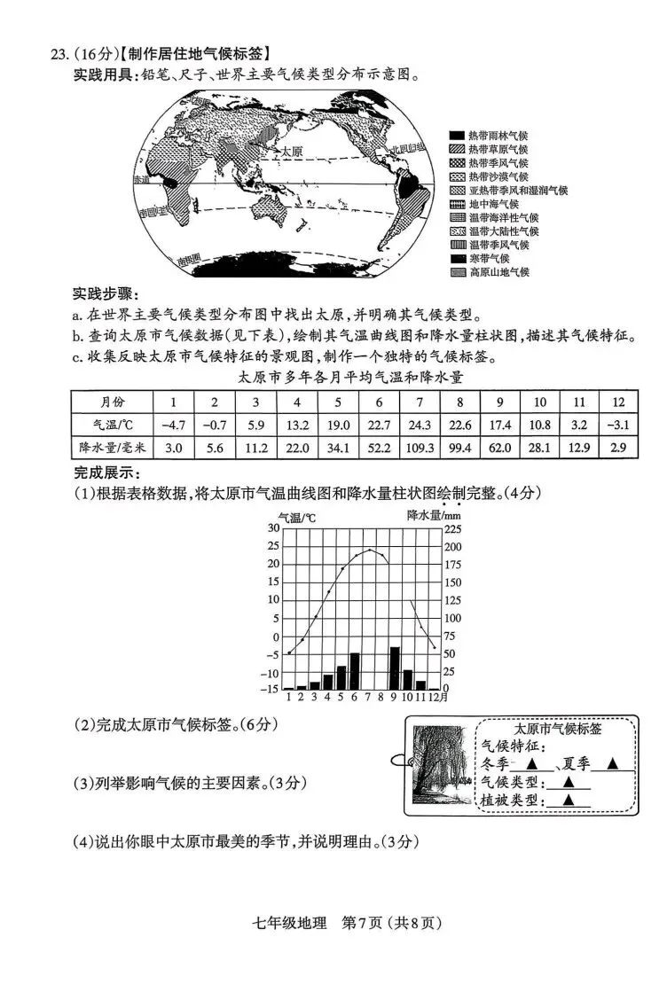 (2)气候特征:冬季寒冷干燥;(2分)夏季高温多雨(2分)