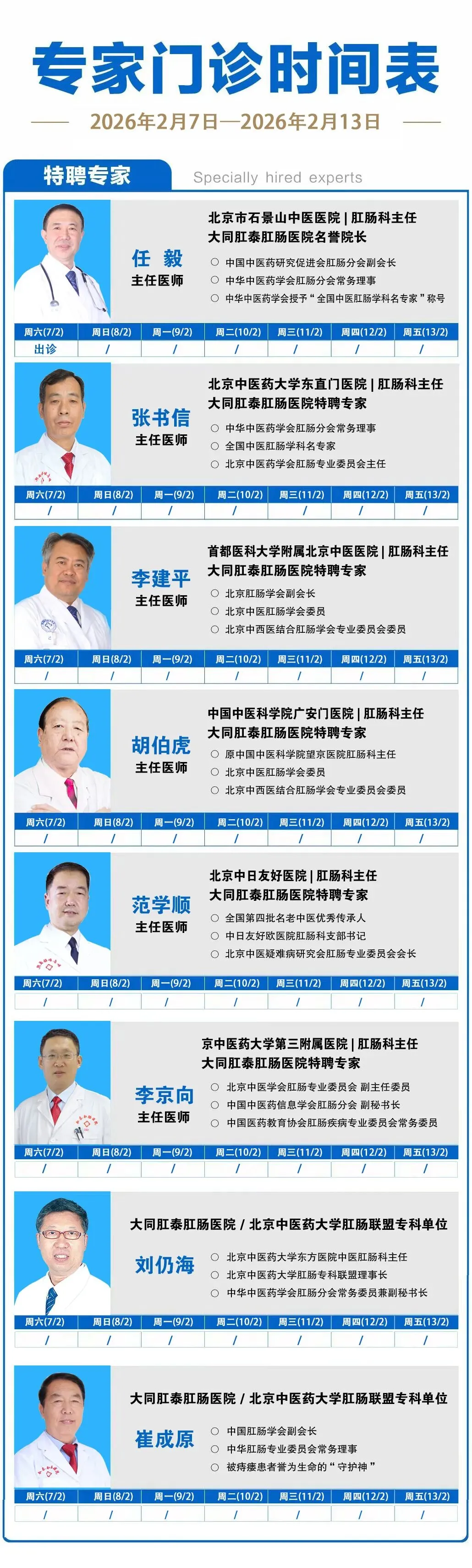 大同肛泰肛肠医院2月7日—2月13日专家排班