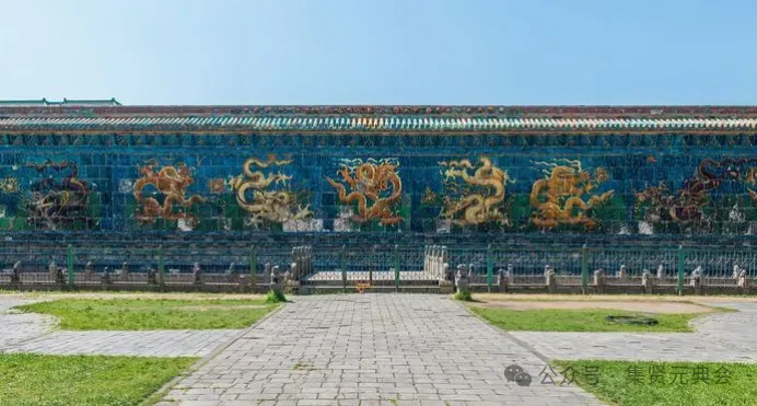 九龙壁长45米、高8米,壁面由五彩琉璃构件组成,九条龙形神各异,每两条之间以水草、白云、山石作为连接,构成一幅生动的画面。正中的一条龙造型最具威严,昂首向前,目光炯炯,气宇轩昂,体现出了我国古代高超的雕刻技艺