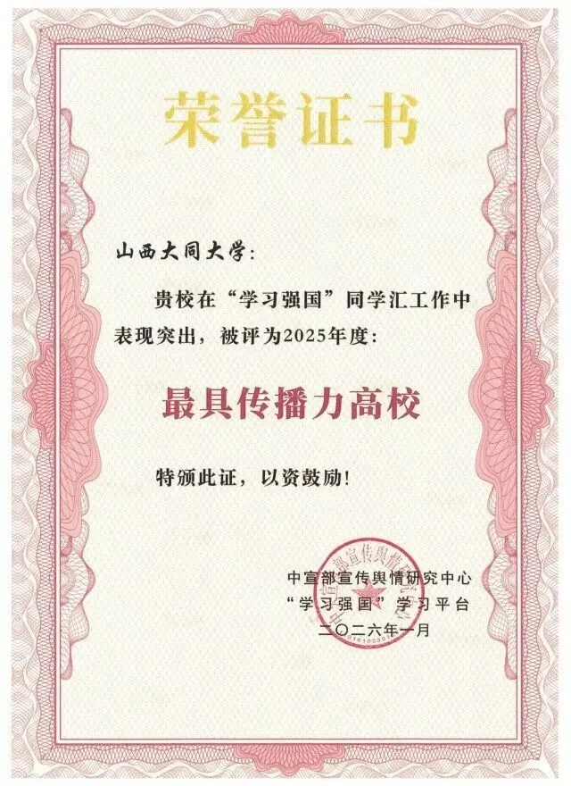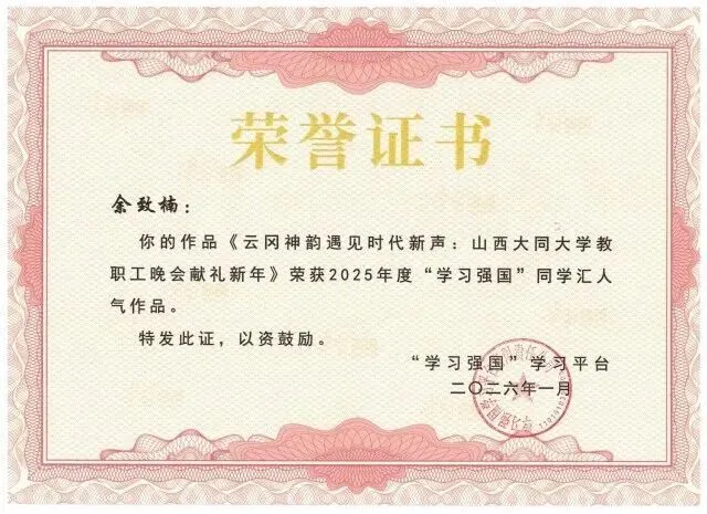 近日,中宣部宣传舆情研究中心、“学习强国”学习平台公布2025年度同学汇评选结果,山西大同大学凭借在内容传播、平台运营、特色实践中的突出表现,再次荣获“年度最具传播力高校”称号。同时,在数万件参评作品中,该校余致楠的《云冈神韵遇见时代新声:山西大同大学教职工晚会献礼新年》获评“年度高校人气作品”。