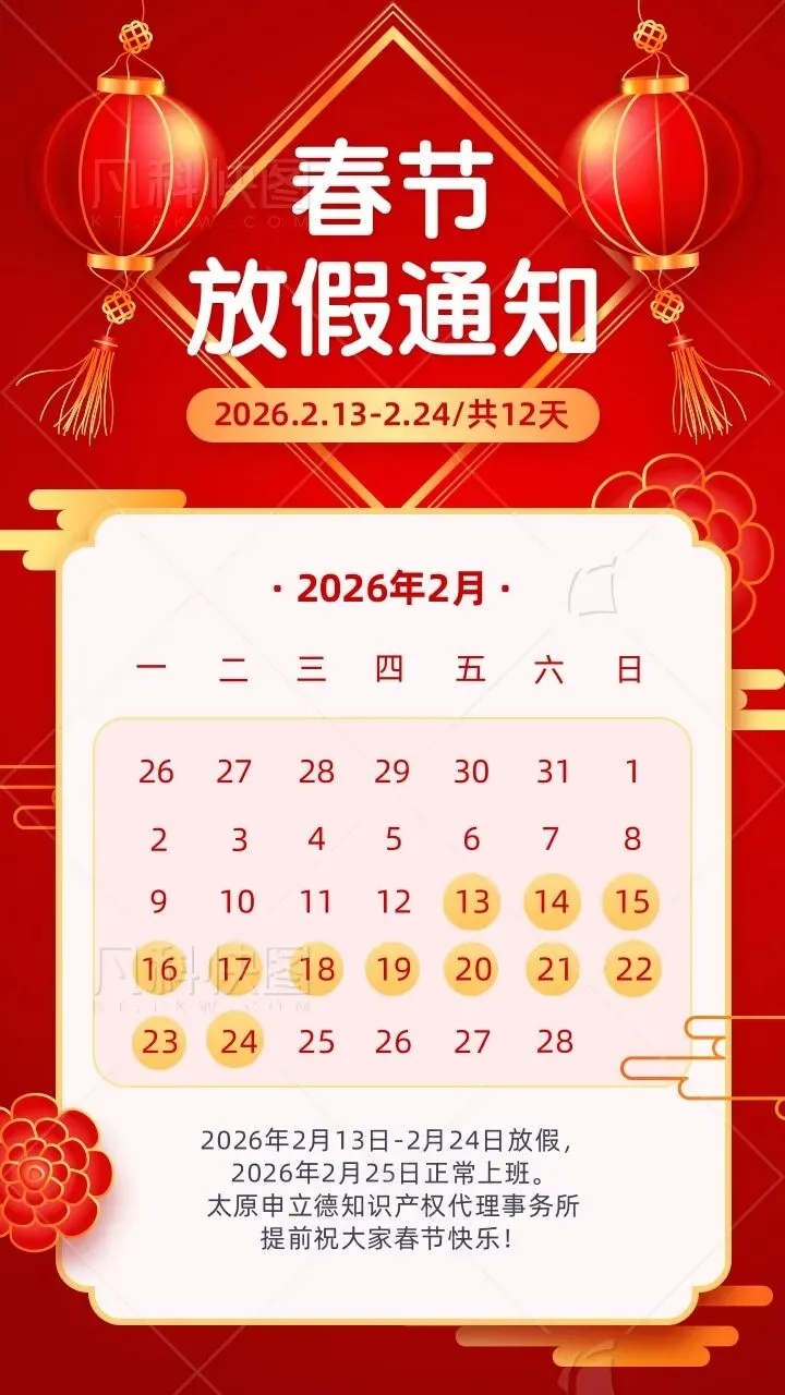 【节假日安排】太原申立德知识产权代理事务所春节放假通知