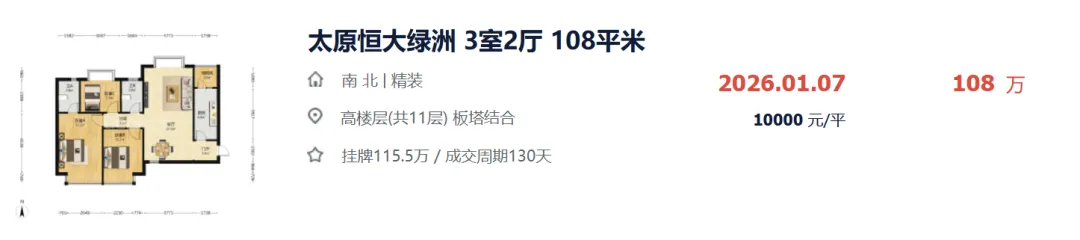1月7日,恒大绿洲成交了一套建面约108㎡的房源,成交单价为10000元/㎡,总价108万,精装修。