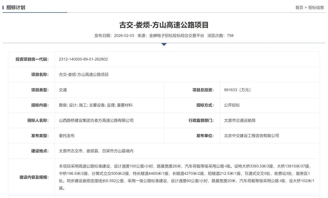 古交-娄烦-方山高速公路项目总投资991633万元,招标内容包含了勘察; 设计; 施工; 主要设备; 监理; 重要材料。建设地点位于太原市古交市、娄烦县、吕梁市方山县境内。