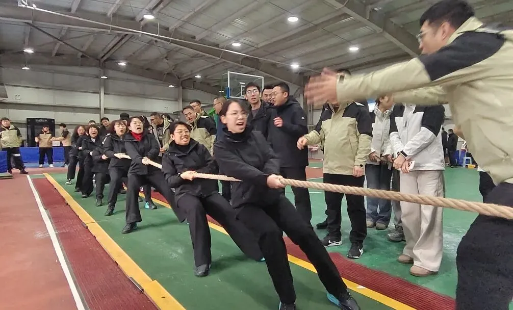 “铛——”随着党委书记郭涛敲响第一声锣声,比赛正式开始!参赛队员们瞬间攥紧粗重的麻绳,双脚稳稳扎根地面、身体整齐后仰。麻绳中间的红绸带在两队之间,时而左移,时而右偏,每一寸挪动都牵动着在场所有人的心弦。