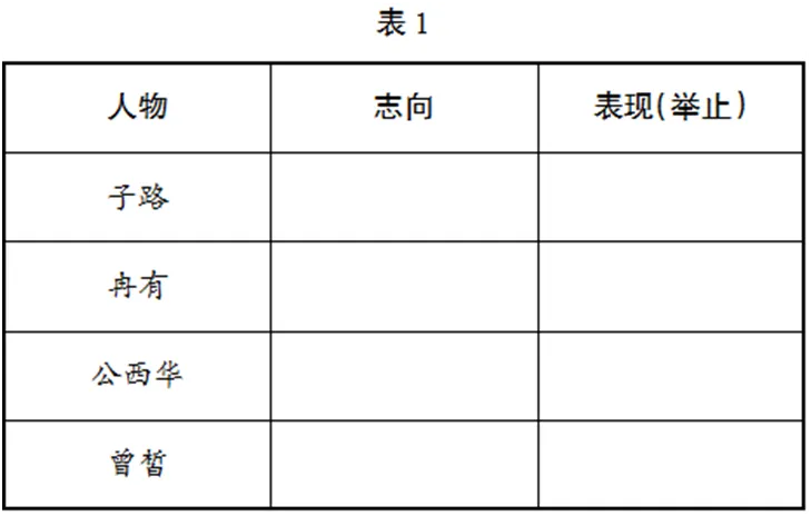 2.品味四弟子的志向。学生合作交流,完成表1。
