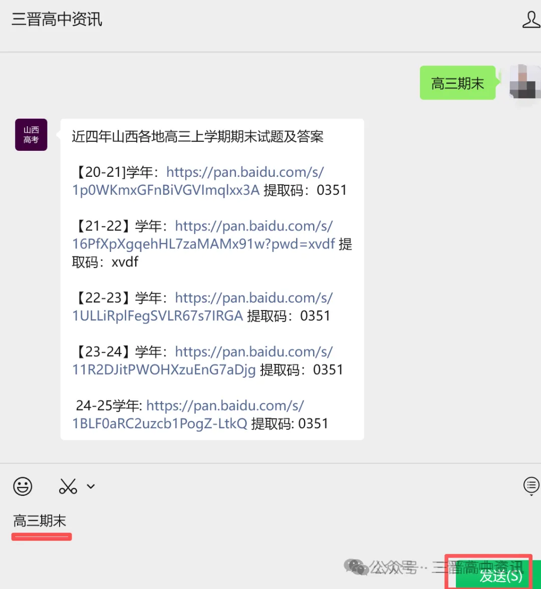 2、分别发消息“高三期末”即可获取下载电子版