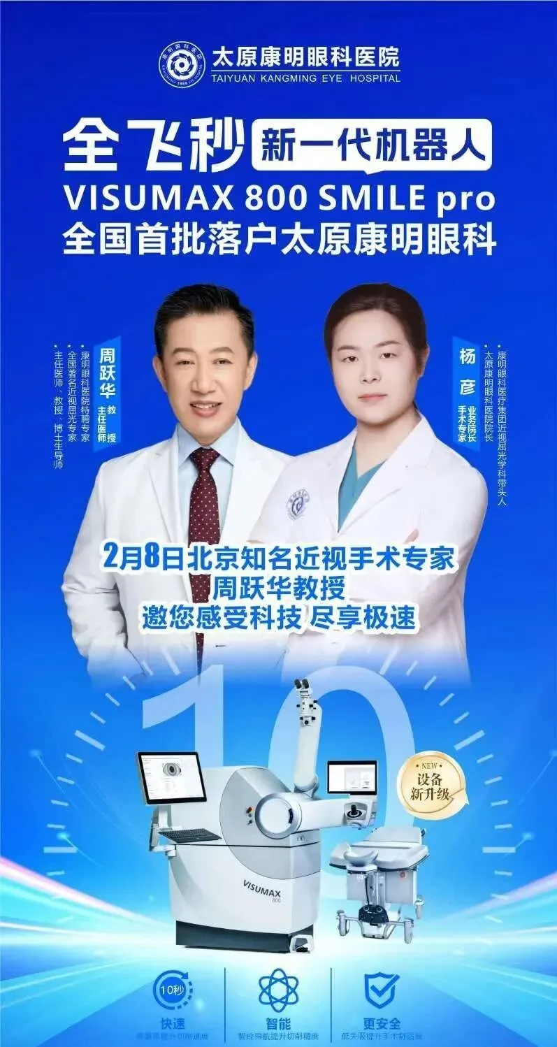 近视党集合!告别模糊束缚、摆脱眼镜困扰的绝佳时机来了🎉太原康明眼科医院双喜临门——不仅重磅引进德国蔡司新一代机器人全飞秒SMILE Pro设备,让近视矫正迈入“超快、智能、更安全”的全新阶段,更特邀国内屈光手术领军人物周跃华教授,于2月8日亲临我院亲诊手术,将顶尖设备与权威专家完美结合,为山西近视患者带来家门口的高端近视矫正服务,无需奔波,就能享受国家级诊疗水准!