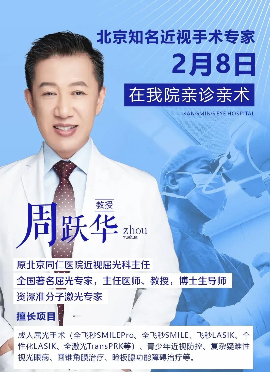 【名医亲诊】北京屈光手术大咖周跃华教授2月8日亲临太原康明眼科手术啦!原北京同仁医院视光中心主任、国内屈光手术领军人物,深耕行业