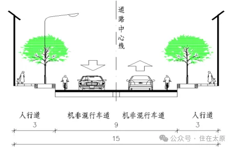丰收路道路横断面:中间9米车行道,两侧各3米人行道(含树穴带)。