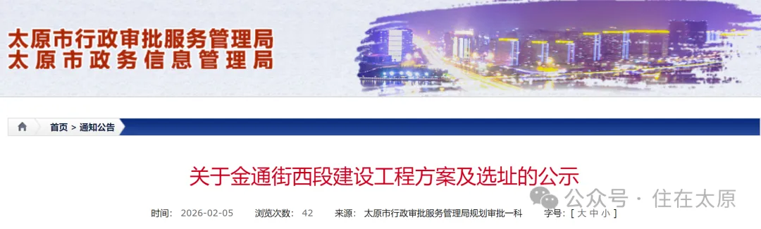 2月5日,太原市行政审批服务管理局网站发布了太原多条道路的选址及设计方案。以下道路主要建设内容包括道路、排水、照明及市政管线配套设施。丰华路:南起北中环街,北至北排洪沟南街,长约470米,红线宽30米,为城市次干路,用地面积约1.4公顷。