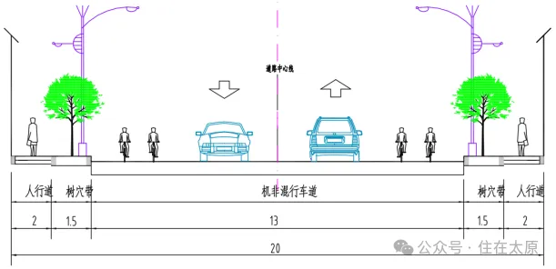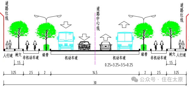 中间14.5米机动车道,两侧各2米绿化分隔带,2.5米非机动车道,3.25米人行道(含树穴带)。
