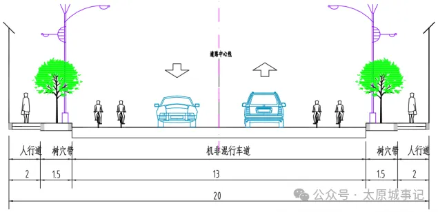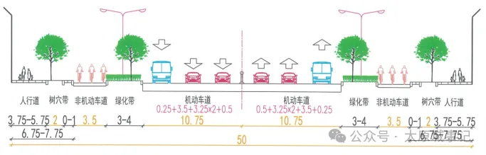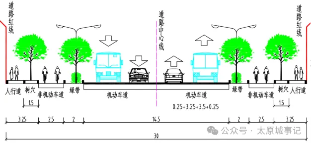标准横断面为中间14.5米机动车道,两侧各2米绿化分隔带,2.5米非机动车道,3.25米人行道(含树穴带)。