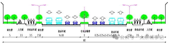 标准横断面为中间3米绿化分隔带,两侧各14米机动车道,2.5米机非绿化分隔带,3.5米非机动车道, 3.5米人行道(含1.5米树穴带),5米绿化带。