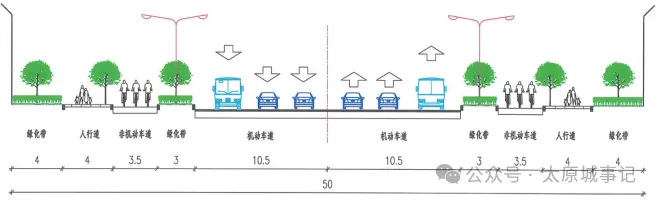 标准横断面为中间21米机动车道,两侧各3米绿化分隔带,3.5米非机动车道,4米人行道(含树穴带),4米绿化带。