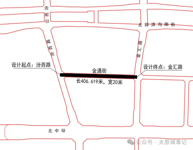 金通街西段建设工程西起汾西路,东至金汇路,长约406米,规划红线宽20米,为城市支路,用地面积约0.8公顷。