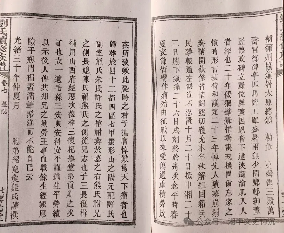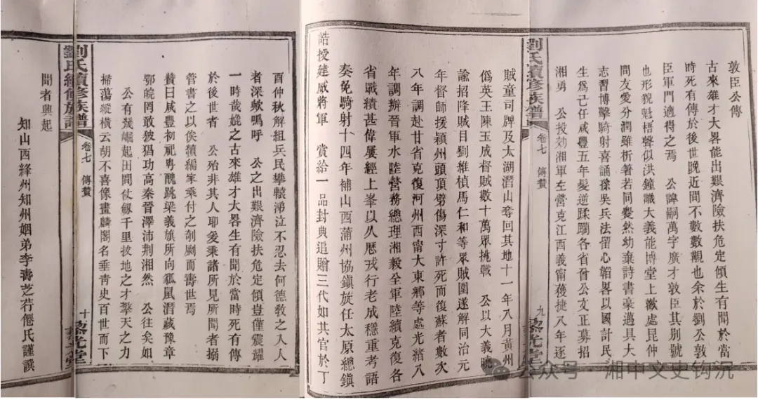 又及:为刘广才撰传的李寿芝,长沙人。承蒙家超平先生提供族谱资料,可知李寿芝班名文畐(骍宇六子),名寿芝,字紫季,号荇仙,一号杏西。廪贡生,候选州同,保升知州,分发甘肃。历任哈密厅通判,陇西、张掖等县知县,保升直隶州知州,改官山西,历任临汾、赵城、平遥、阳曲等县知县,绛州直隶州知州,武川厅同知。诰授奉政大夫。道光十七年正月二十五日生,寿七十六岁,卒于民国元年七月二十三日。原配王氏,副室安氏,再副罗氏,三副张氏,四副刘氏(河北人),五副室戈氏。子五存次子章鑨(兼祧);女三存二,长芍卿,适湘乡庠生成希孟(西阳成氏,成果道第三子);次竹卿,适邵阳庠生魏守珹。李寿芝三兄李寿蓉(字篁仙),为道光二十五年(1845年)进士,与王闿运等并称“湖湘五子”,且为谭嗣同岳父,又为楹联大家。来源:湘中文史钩沉