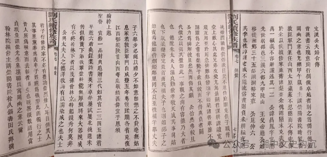 刘广才请当时知名文人为其曾祖、祖和父辈撰写传记和墓志铭,《帝逊公夫妇合传》为湖北德安府安陆县庠生徐绍远撰,时在光绪二十年;《久文公夫妇合传》为洲上邑庠生朱轮撰;《定汉公夫妇合传》为翰林院编修、主讲崇阳书院徐久锡寿田氏撰。《久文府君墓表》《定汉府君墓表》均由大石邑增生朱增棫撰,时在同治八年。显亲扬名,可谓孝之大者!