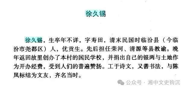 补白:为定汉公夫妇作传的徐久锡,署名为翰林院编修,然遍查翰林中无其人。得刘海钧兄之助,查得徐久锡实为优贡生,山西临汾人,任过教谕和训导,工诗文,善书法。至于其翰林院编修,或是据《会典》得蒙恩赏之衔。查同治刊《湘乡县志》选举志之恩赏,90岁的彭华札先后被赏给举人和翰林院检讨衔。而95岁以上,可给编修衔。则可知徐久锡先生高寿矣!