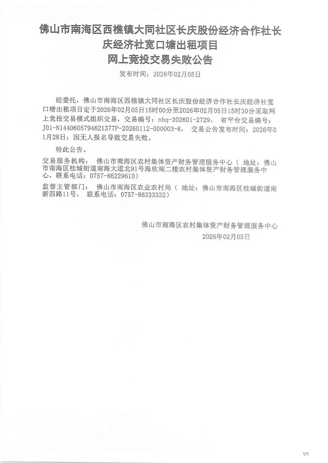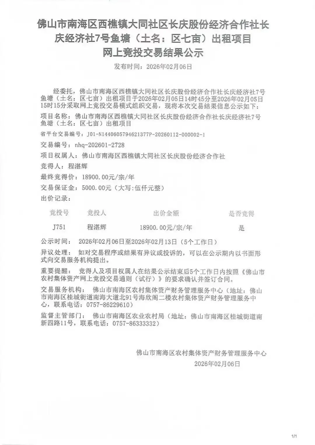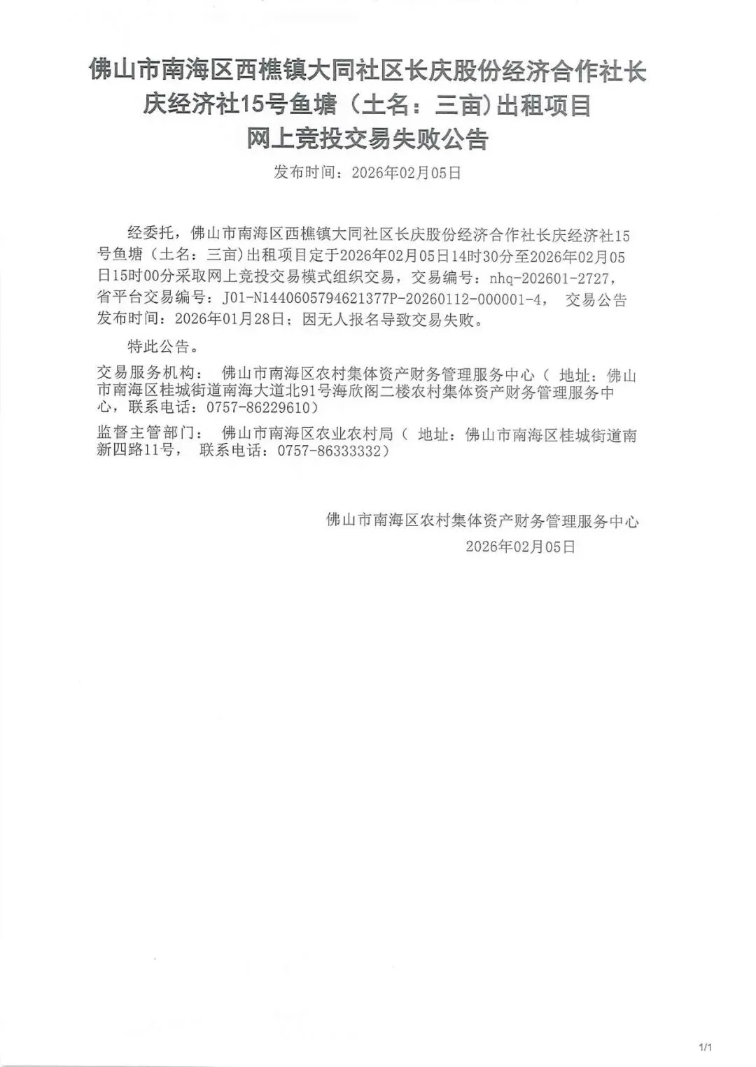 大同社区长庆经济社15号鱼塘(土名:三亩)、7号鱼塘(土名:区七亩)、宽口塘共3个鱼塘出租网上竞投交易结果公示与交易失败公告