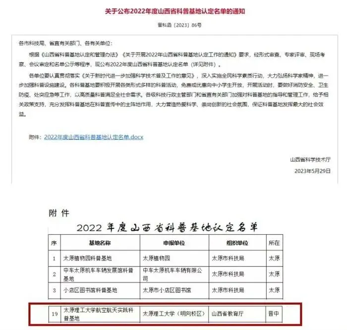 近日,山西省科技厅发布了《关于公布2022年度山西省科普基地认定名单的通知》,我校航空航天实践科普基地成功入选。