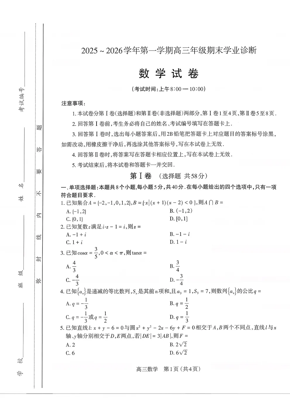 【太原期末全科】太原市2025-2026学年度第一学期高三年级期末学业诊断考试
