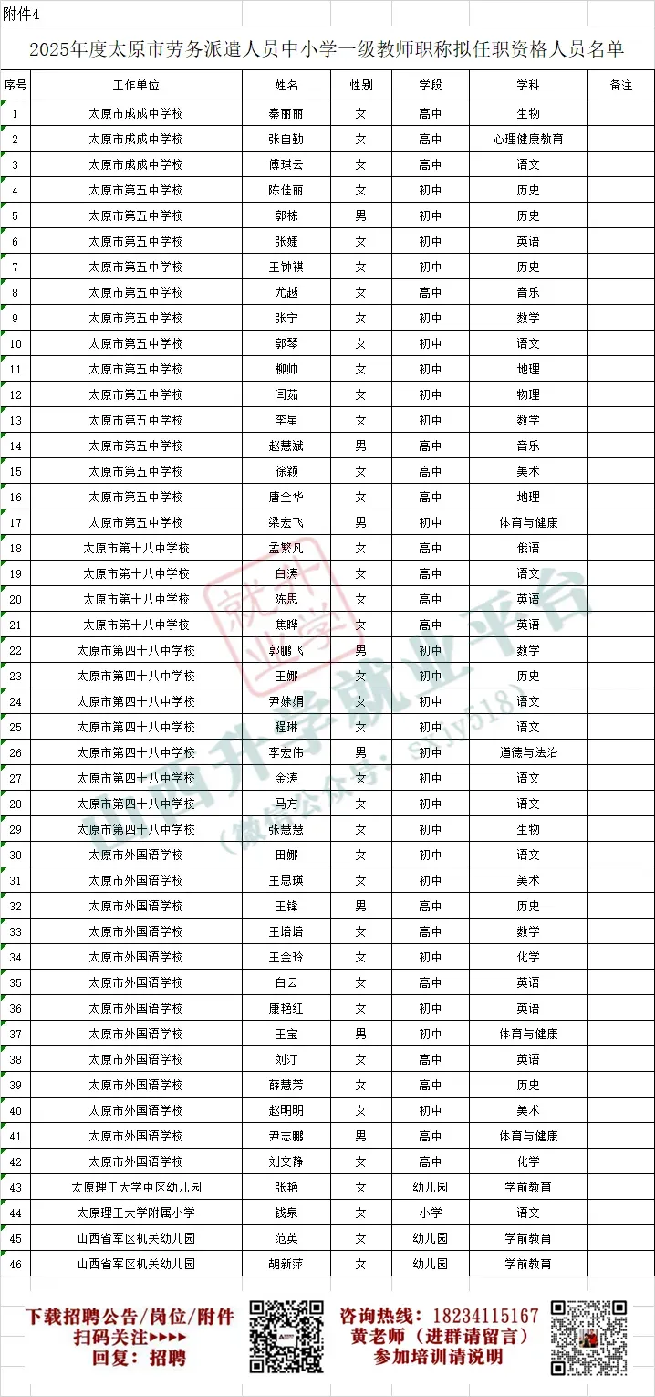 • 4.2025年度太原市劳务派遣人员中小学一级教师职称拟任职资格人员名单