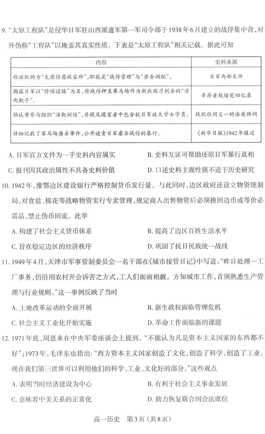 太原 2025-2026 第一学期 高一期末 学业诊断 历史