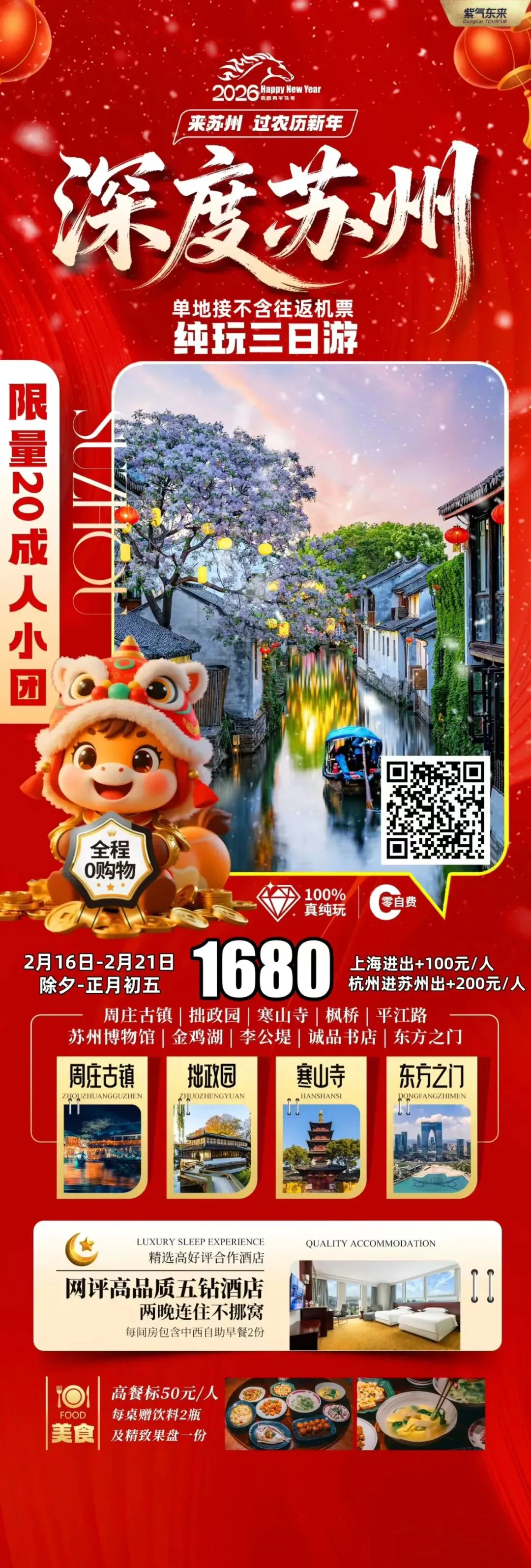 [玫瑰]深度苏州:五钻+20人小团+50*1餐+0购物