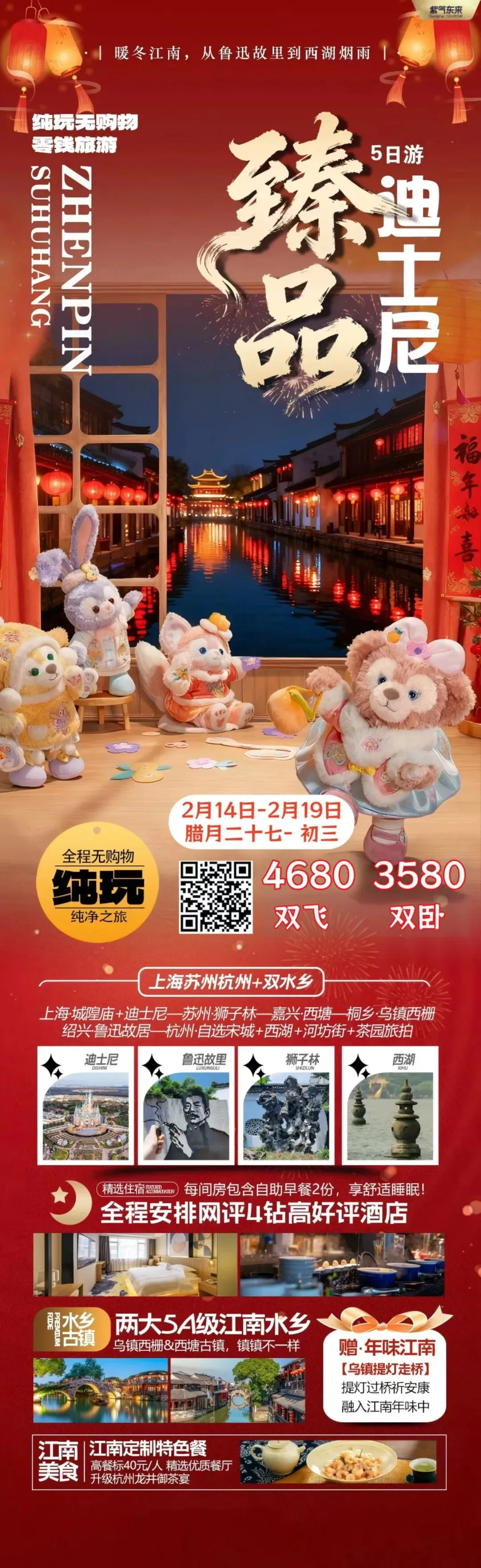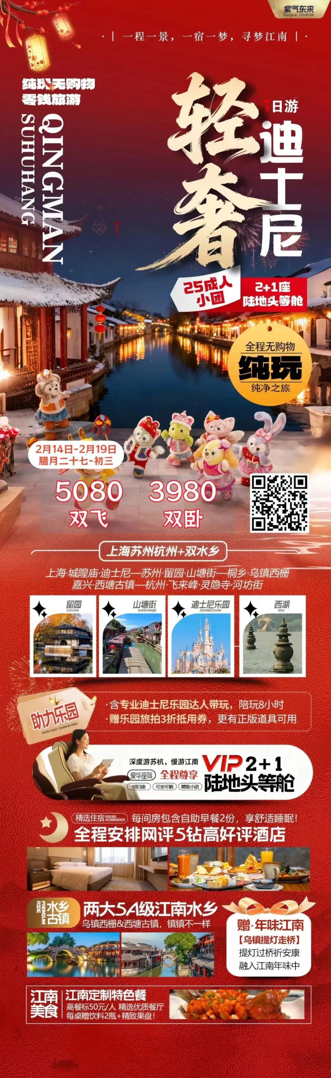 [玫瑰]轻奢迪士尼:苏沪杭+迪士尼+25人团+2+1车+5钻+50*2餐+0购物[玫瑰]畅游江南:华五商务+乌镇+25*4餐+丝绸珍珠[玫瑰]乐游江南:华五+绍兴+三钻+周庄+30*4餐+1丝绸[玫瑰]纯玩江南:华六三钻+周庄4钻+30*4餐+0购物[玫瑰]江浙沪包游:华六+三钻+30*4餐+0购含夜景[玫瑰]遇见希尔顿:华六+四钻+希尔顿+40*4+0购物[玫瑰]纯净江南:华六+维也纳+30*4餐+0购物[玫瑰]经典江南:华五+四钻+五钻+50*3餐+0购物[玫瑰]奢享江南:华五+四钻+五钻+50*3餐+0购物[玫瑰]江南头等舱:华五+五钻+西栅内+50*8餐+2+1车型+0购物春节热收独立班系列