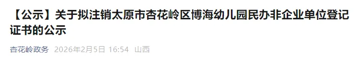 我单位于2026年2月4日受理太原市杏花岭区博海幼儿园申请注销民办非企业单位登记证书的材料,统一社会信用代码:52140107MJY539541C。按照《民办非企业单位登记管理暂行条例》第十六条、第十七条、第十八条规定,拟决定注销太原市杏花岭区博海幼儿园民办非企业单位登记证书,现予以公示,公示期7个工作日(2026年2月5日—2026年2月13日)。