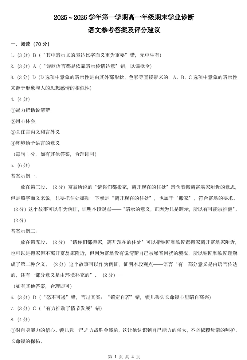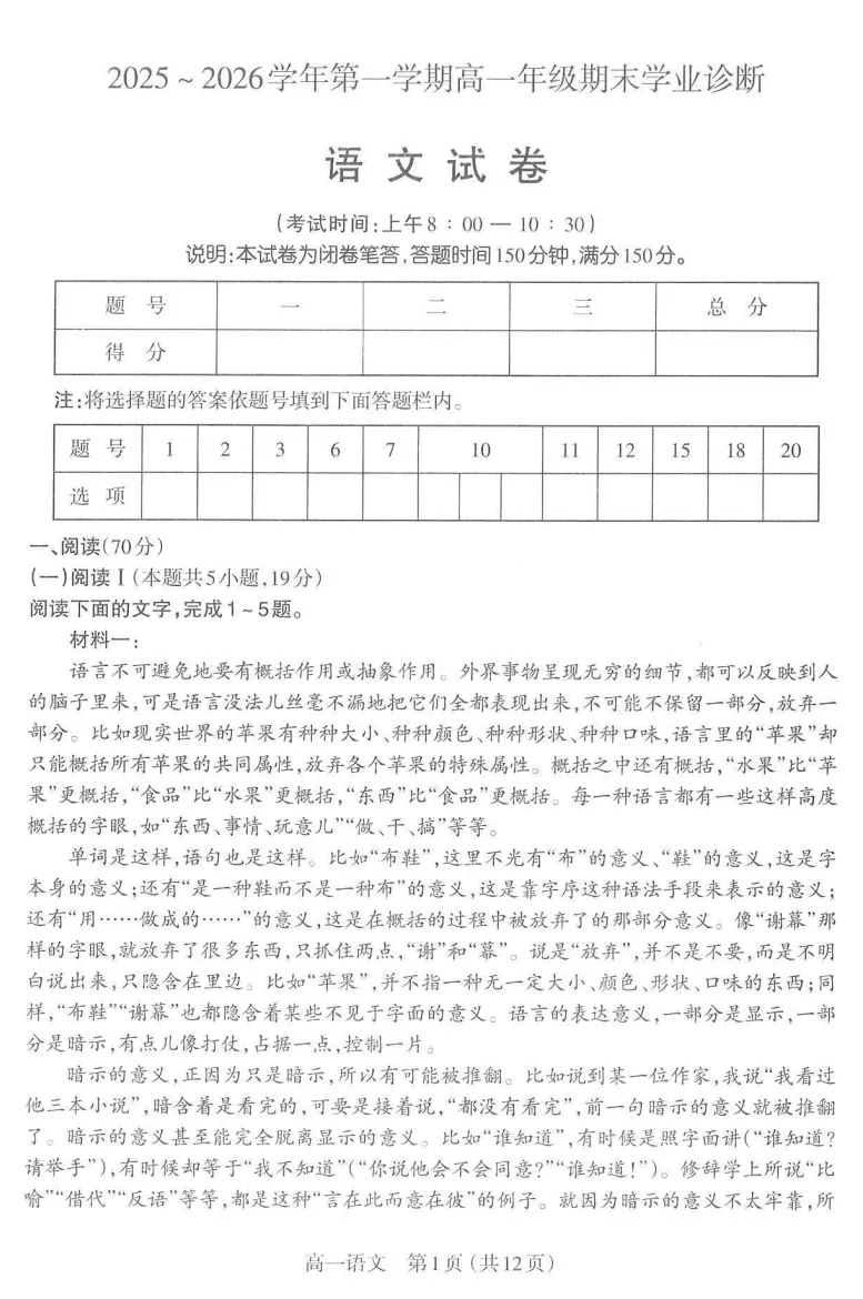 2025-2026学年山西太原市高一第一学期期末学业诊断语文试卷