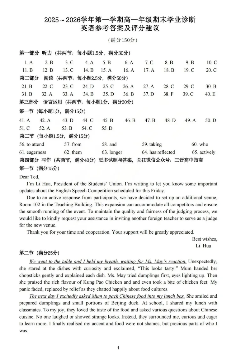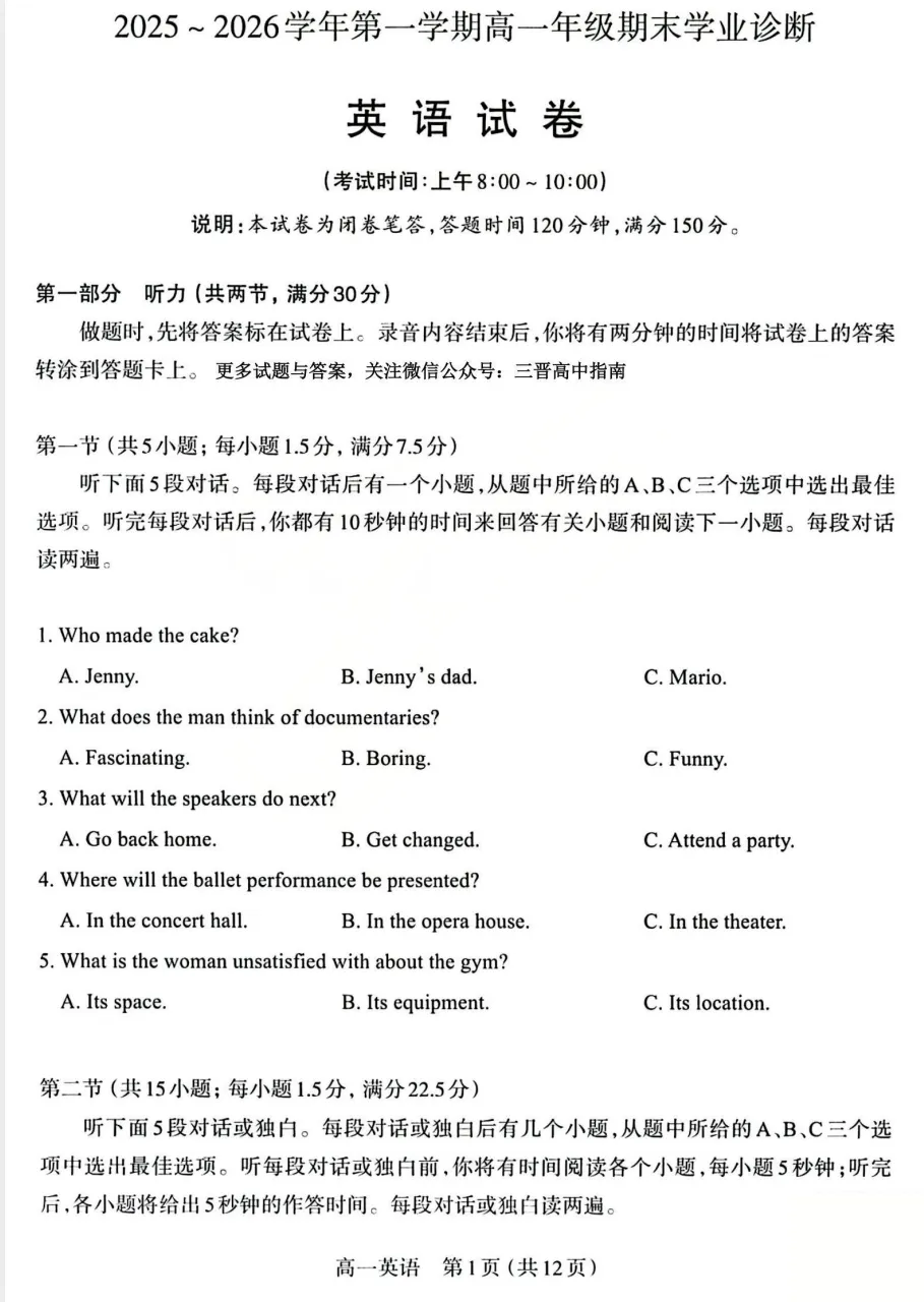 2025-2026学年山西太原市高一第一学期期末学业诊断英语试卷