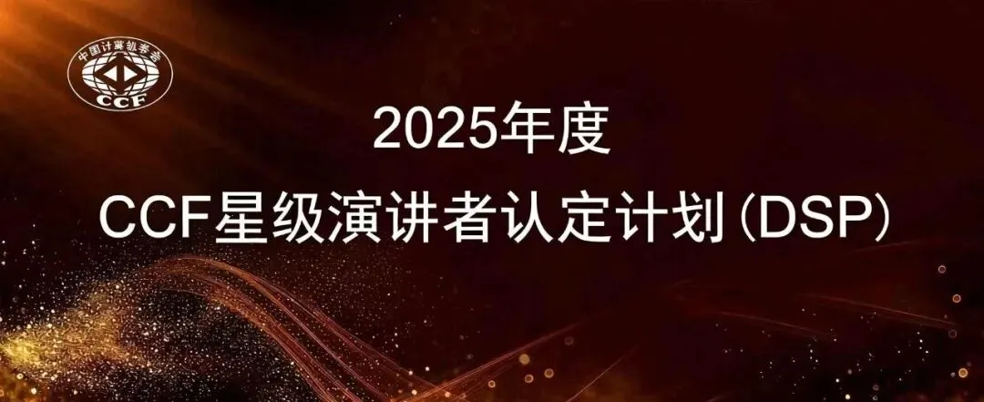 CCF从2013年起实施“杰出演讲者计划(Distinguished Speaker Program,DSP)”,现更名为“星级演讲者认定计划(Designated Speaker Program,DSP)”。目的是鼓励更多专家为CCF及会员服务贡献学识和智慧,并对其学术水平和贡献给予认可。凡在其专业领域有相当的水平及公认的成就,并以志愿者的身份在CCF组织的活动上演讲并达到CCF所要求的质量和数量的CCF会员均可申请成为CCF星级演讲者。