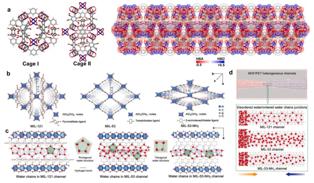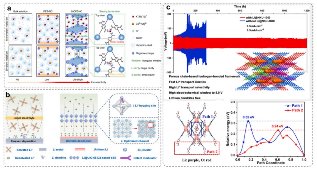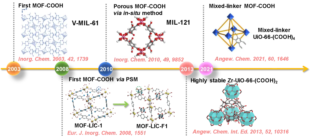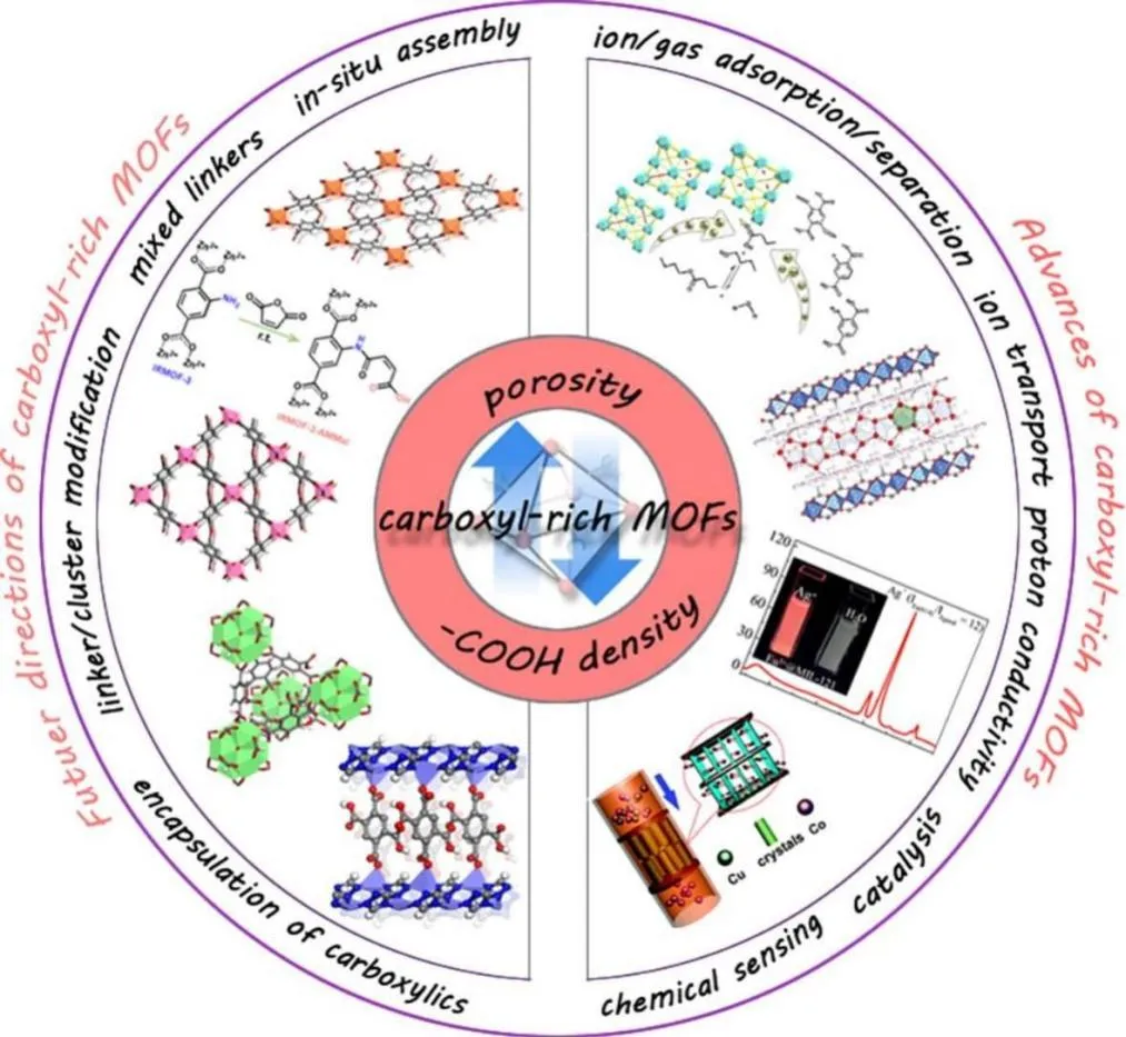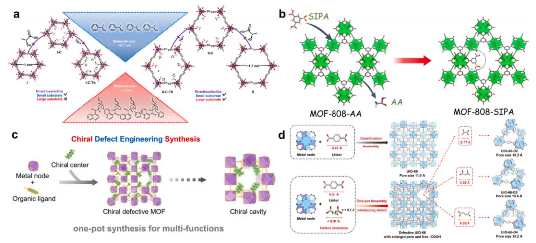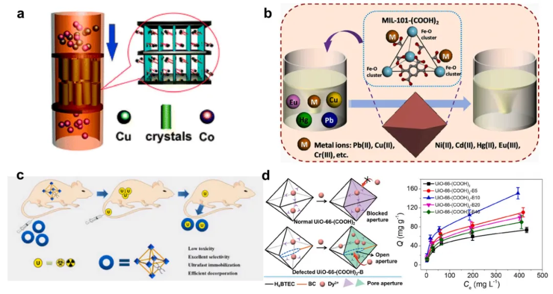 要点:图3a为UiO-66-H2和混合配体UiO-66-H2/H4的制备路线,1,2,4,5-H4BTEC和H6BHC两种配体在水相中与Zr4+离子同时反应,制备了混合配体的UiO-66-H2/H4。H6BHC和1,2,4,5-H4BTEC上额外多出的四个或两个游离羧基,赋予了该材料高达6.2 mmol g-1的羧基密度。图3b为MIL-121-H2和混合配体MIL-121-H2/H4的制备路线,在较低用量的H6BHC和1,2,4,5-H4BTEC配体比例下,形成的样品呈现出MIL-121拓扑结构,而更高的配体比例则会诱导MIL-116类结构的形成。因此,在定制MOFs的化学性质和孔道性质时,应充分考虑有机配体的竞争配位特性。图3c为单配体和混合配体Cr-MIL-101-X/Y的制备示意图,在常规反应条件下无法成功合成纯相Cr-MIL-101-COOH,但当与其他官能团(例如-H、-NO2、-Br和-CH3)组合时,并在1,2,4-H3BTC配体摩尔百分比相对较高(46%-54%)的情况下被证明是可行的。因此,混合配体策略是引入特定配体的可行路径。