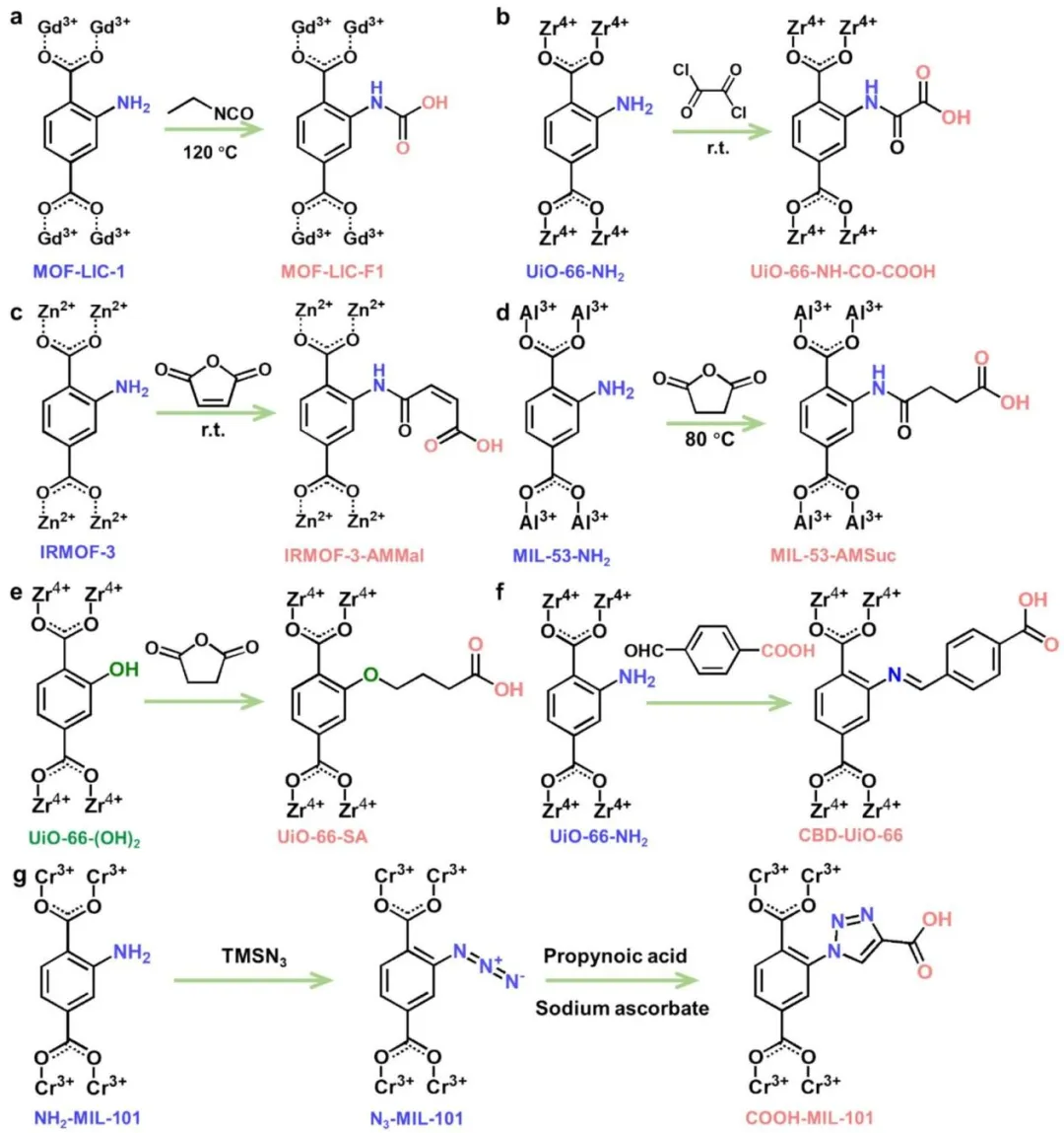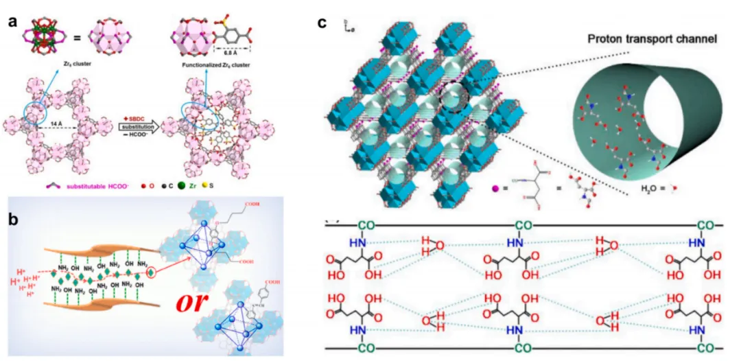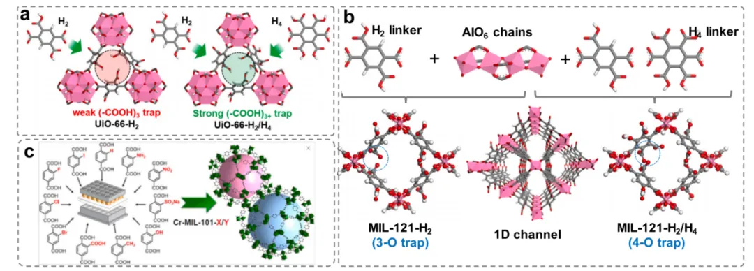 Figure 3. (a)UiO-66-H2和UiO-66-H2/H4的制备路线;(b)MIL-121-H2和MIL-121-H2/H4的制备路线;(c)单一配体和混合配体Cr-MIL-101-X/Y的制备