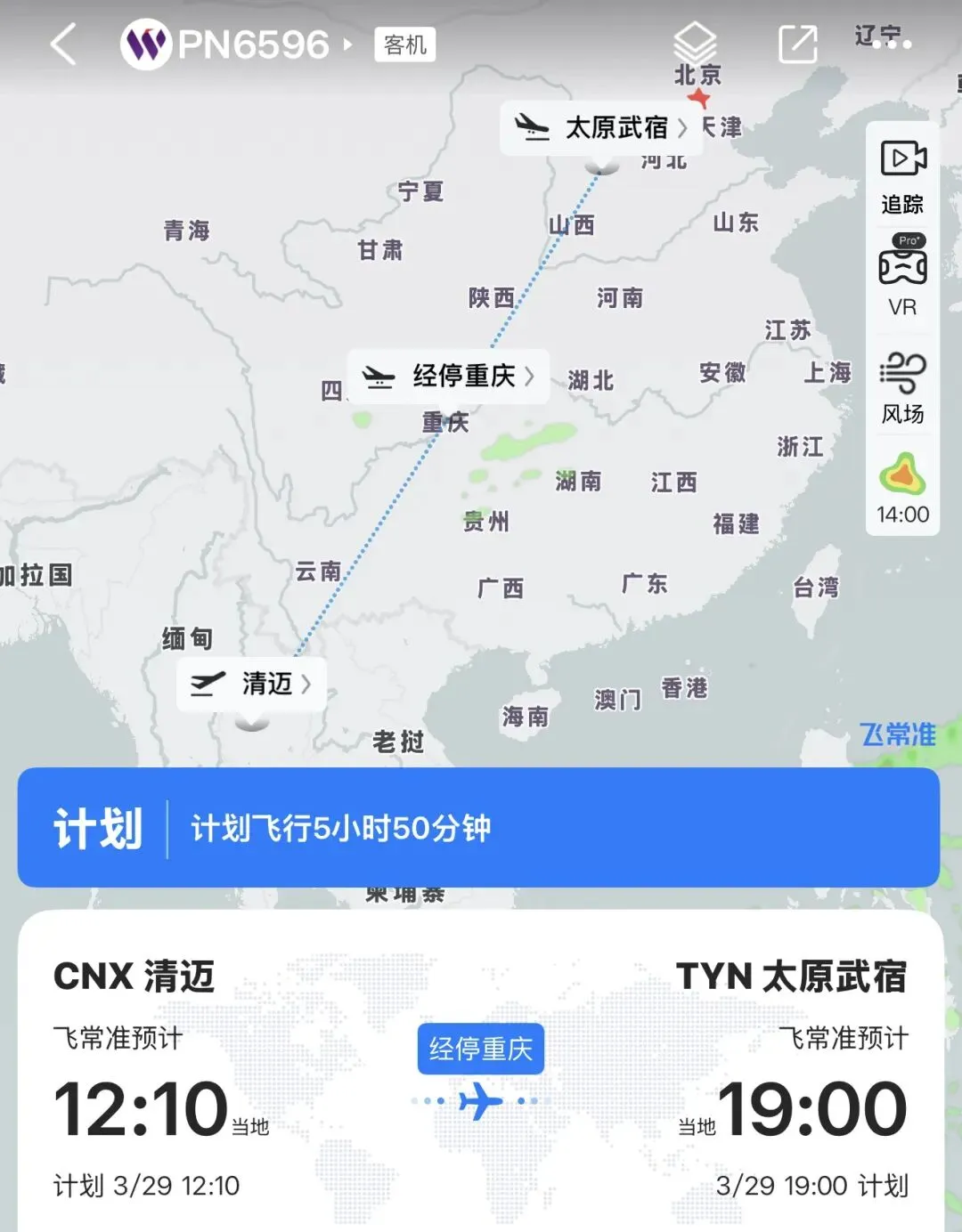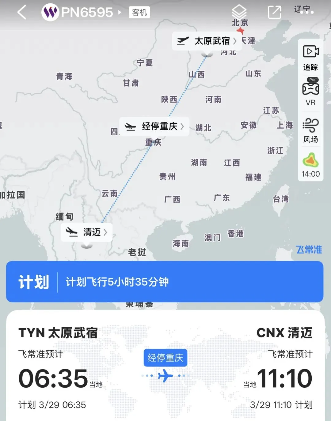 西部航空计划3月29日起开航 太原武宿-重庆江北-泰国清迈 航线。太原-重庆-清迈航班号PN6595