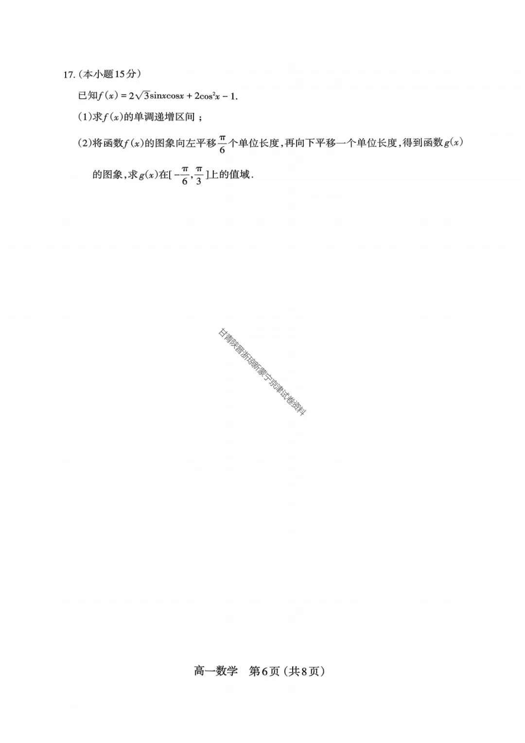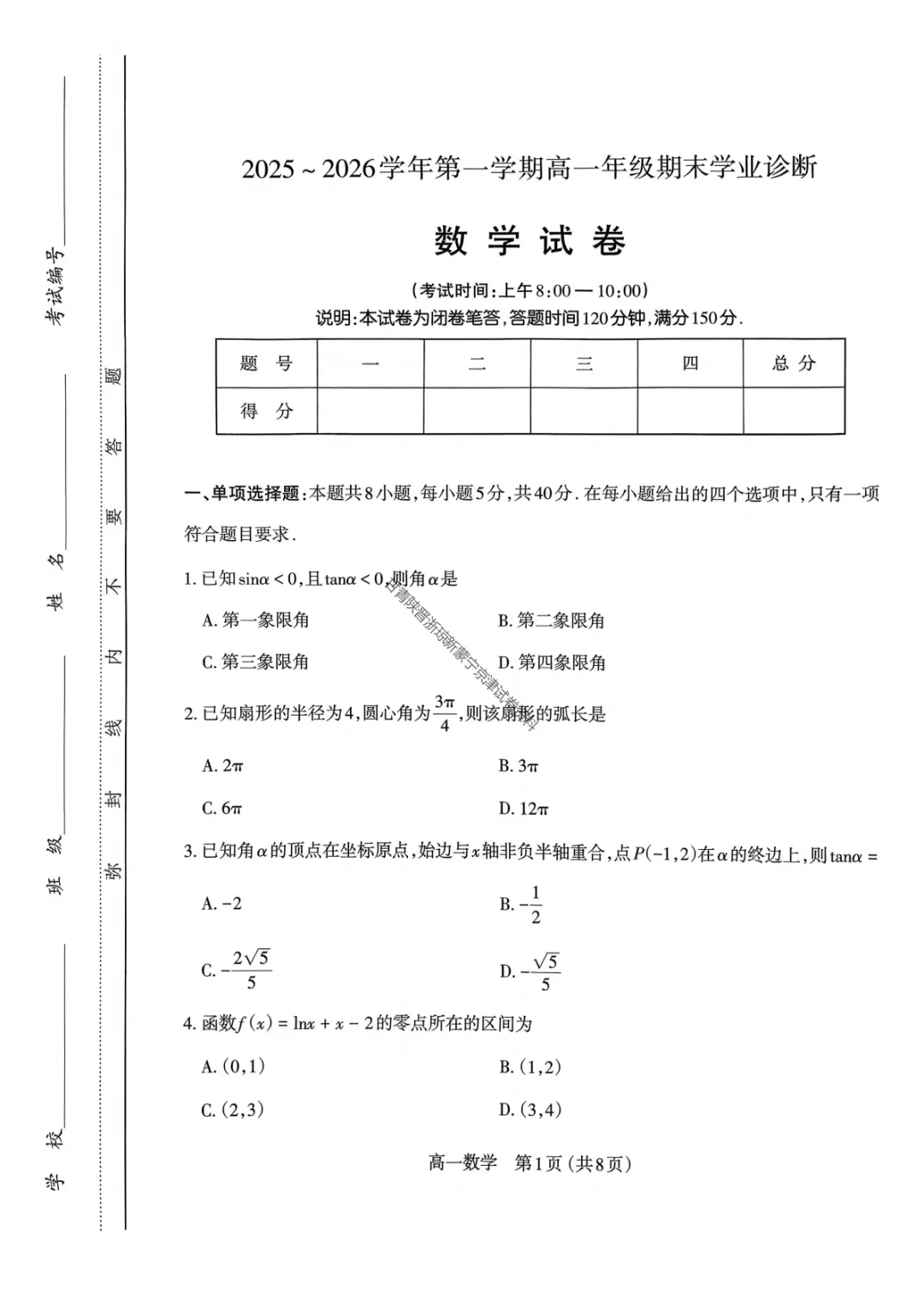 2025-2026学年山西太原市高一第一学期期末学业诊断试卷及答案汇总【语数外物化生政史地】