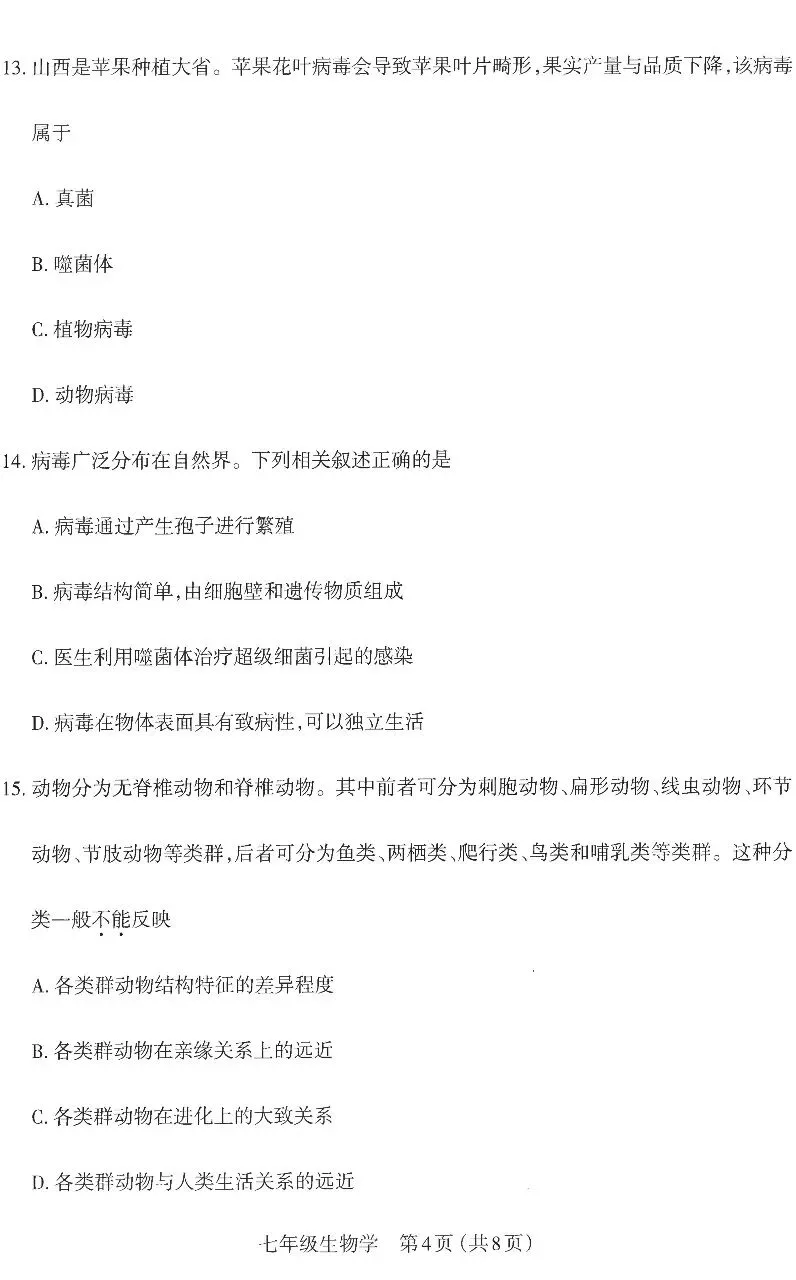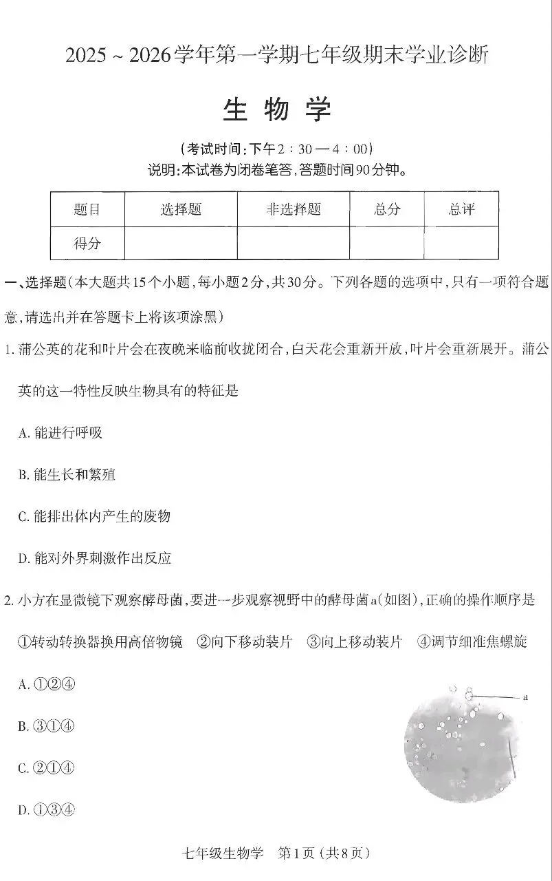 2025~2026学年第一学期七年级期末学业诊断生物学试题参考答案