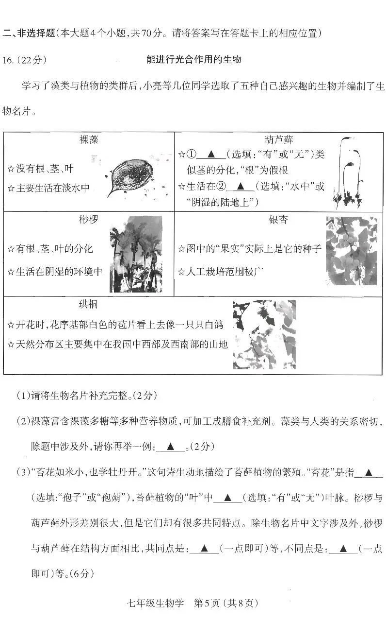 (3)孢蒴无都有孢子;都有进行光合作用的结构(一点即可,其他合理亦可)(2分)桫