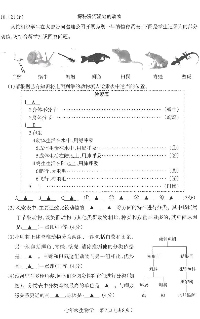 (1)无脊柱有脊柱胎生鲫鱼青蛙壁虎白鹭