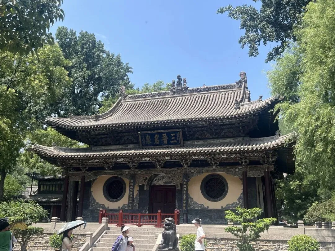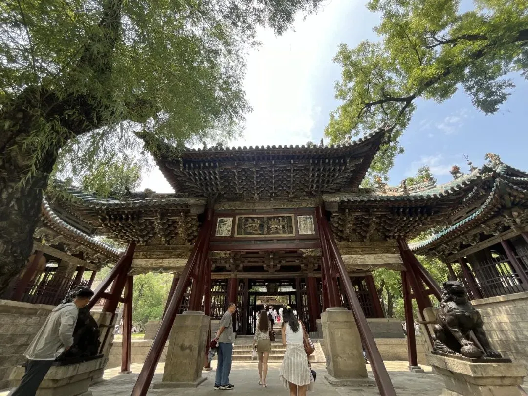 最后是三匾。“难老”匾是难老泉亭的匾额,长1.45米,宽0.7米,是明末清初著名的思想家、文学家、诗人、医学家、书画家傅山所题。“难老”二字出自《诗经》中“永锡难老”,意味生生不息,青春永驻,其用笔苍劲,颇具神韵。水镜台是一座古戏台,悬挂匾额“水镜台”。“水镜”之名取自《汉书》名句“清水明镜不可以形逃”,寓意为人世间的善恶忠奸尽人皆知。此匾由清乾隆翰林、著名书法家杨二酉所题,书体清秀,笔力遒劲。对越坊悬挂匾额“对越”。“对越”二字出自《诗经》中“对越在天,骏奔走在庙”“对”为报答,“越”为宣扬,意为报答宣扬祖先的高尚功德。“对越”匾相传由太原县举人、书法家高应元所书,“对越”二字为榜书金字,笔力遒劲,气势磅礴,宛如山岳嵯峨,棱角俏丽。