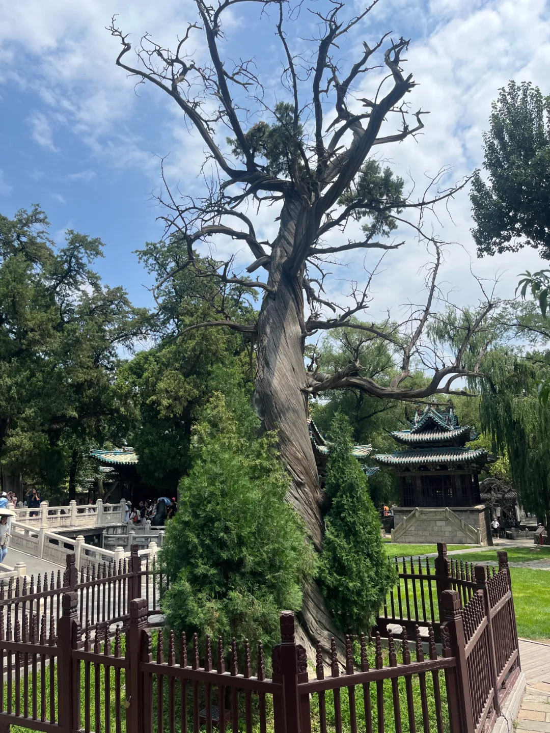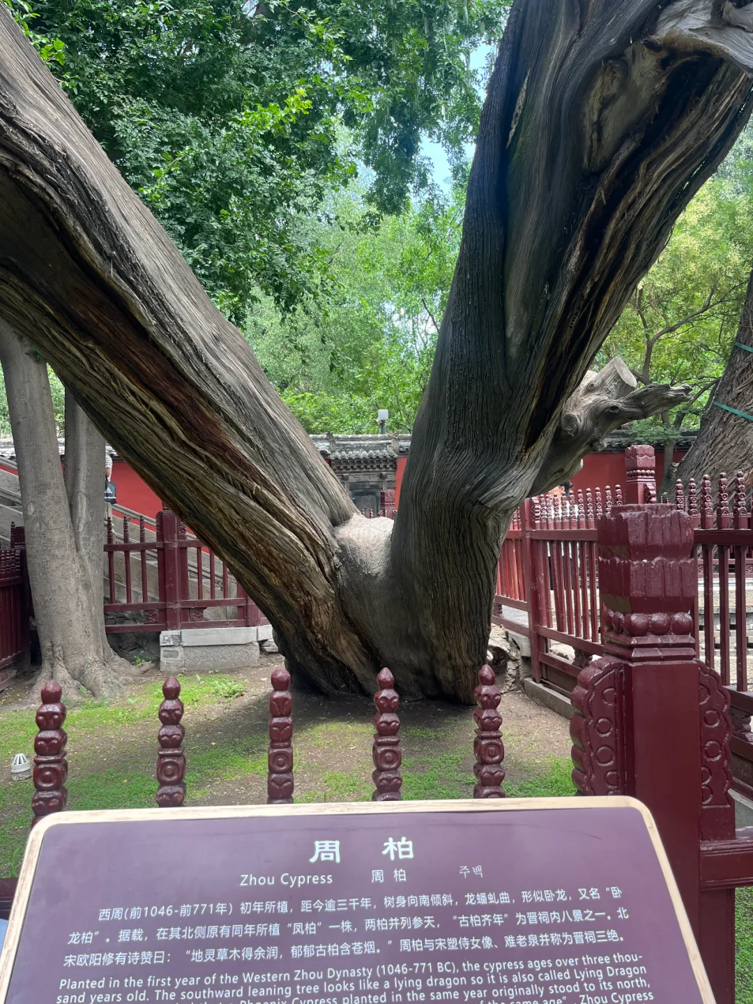 周柏长于圣母殿右侧,18米长的周柏向南倾斜生长,被另一株古柏所支撑,树叶披覆在圣母殿顶,树干粗壮,得几人才能合抱,像一条横卧的巨龙,因此有“卧龙柏”之美誉。经科学测定,此树已有二千九百九十多岁。在晋祠,树龄在千年以上的苍松、翠柏、古槐等尚存二十余株,它们和古柏一起见证着晋祠的悠悠历史。漫步晋祠,四五百年的古树都成小辈了,确实积淀深厚。