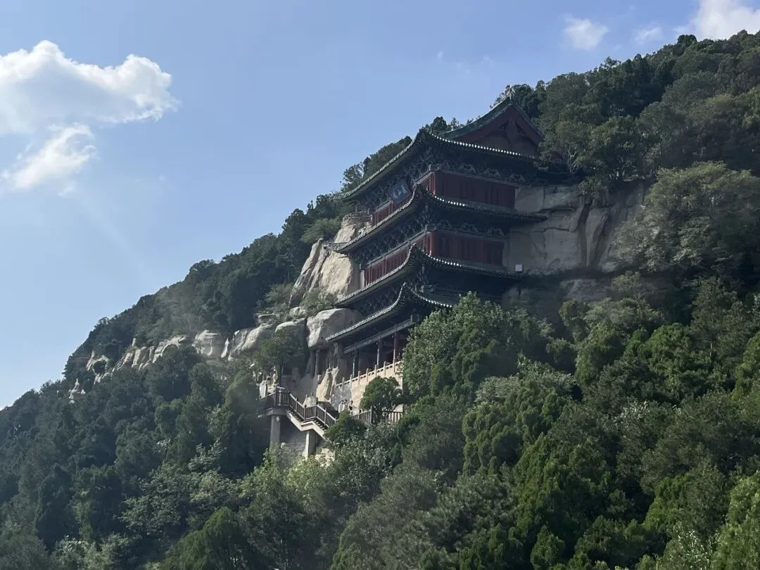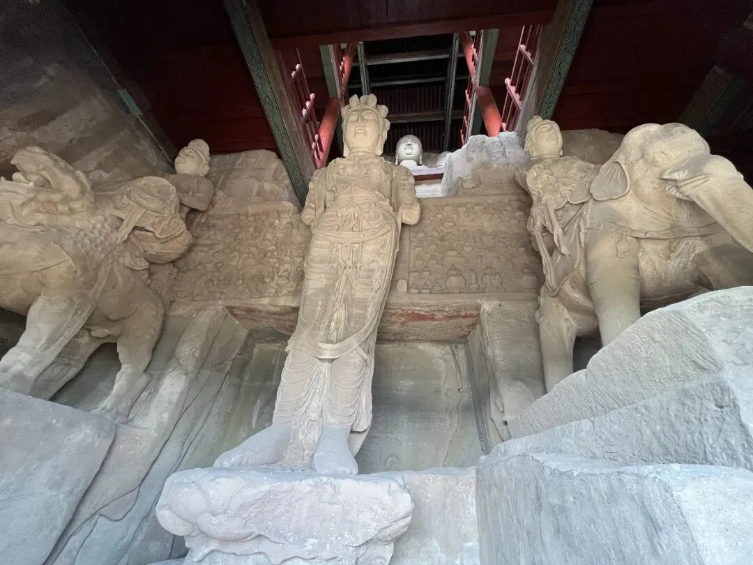 上世纪20年代初,石窟遭到帝国主义的严重破坏,其中的大部分精品被盗运到国外,散失在日本和欧美等国。如今的石窟多剩残存,看到没有佛头只剩佛身的石窟,不由潸然。如今,天龙山最大的石窟为西峰大佛山的第九窟,窟上建有宏伟的木构阁楼以保护石刻造像,称为“漫山阁”。漫山阁为四重檐歇山顶,高与山齐,气魄雄伟,风铃叮当,近看十分壮观,远眺犹如镶嵌在绝壁的琼楼。上层坐佛一尊,高八米,足踏莲花,头顶苍天,比例和谐,衣纹流畅,容貌端庄。下层中间立十一面观音、文殊、普贤各骑青狮、白象分其左右,造型精美,技巧娴熟,皆为唐代雕刻艺术中的珍品。